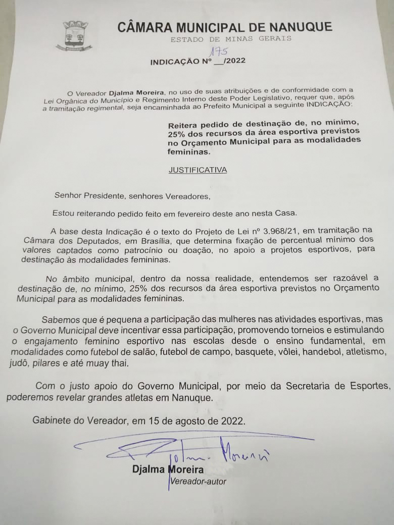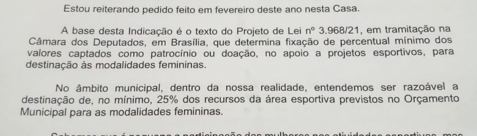 O vereador também solicita que seja destinado às modalidades esportivas feminina ao menos 25% dos recursos da área esportiva previstos no orçamento municipal. Para incentivar maior participação feminina nos esportes do município que tem sido cada vez maior, é necessário a disponibilização de recursos sendo investidos nas atividades esportivas femininas, proporcionando torneios e estimulando o engajamento feminino esportivo nas escolas desde o ensino fundamental em diversas modalidades, e revelando novos talentos no município.