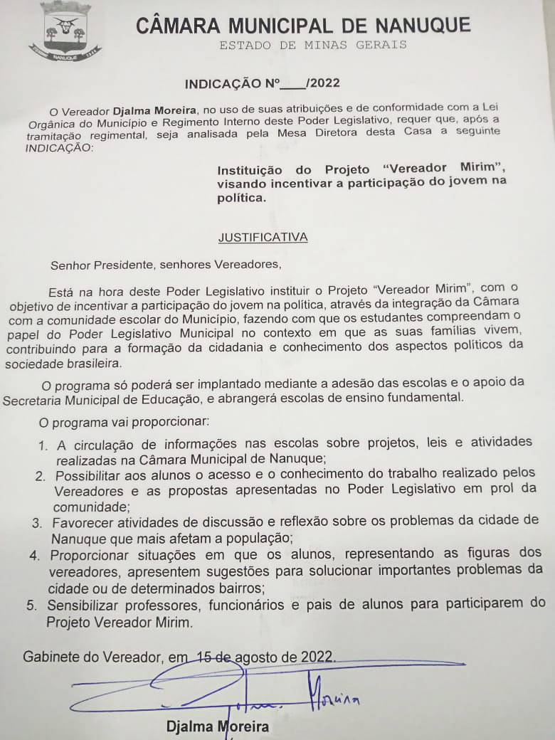 -A circulação de informações nas escolas sobre projetos, leis e atividades realizadas na Câmara Municipal de Nanuque;