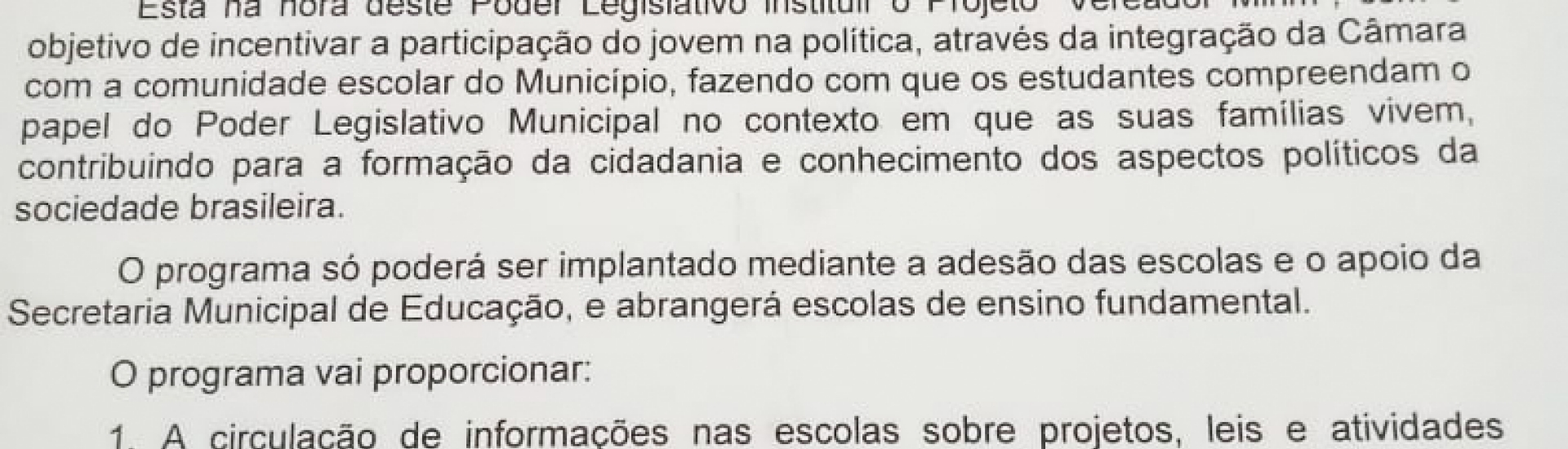 Para a adoção de medidas político administrativas de interesse da comunidade o vereador propôs a implementação do projeto "Vereador Mirim", objetivando elevar o conhecimento dos jovens ao contexto do Poder Legilativo Municipal, exclarecendo as funções e importância de se manter integrado nos assuntos políticos que faz parte do meio social e de convívio da população, elevando o nível conhecimento e aumentando o nível de cidadania da sociedade.