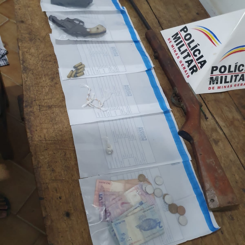 Em continuidade às diligências foi realizada buscas na residência do suspeito sendo encontrada uma espingarda polveira de fabricação artesanal, um simulacro de pistola, 01 bucha de maconha, 14 pedras de crack e uma quantia de R$ 39,25.