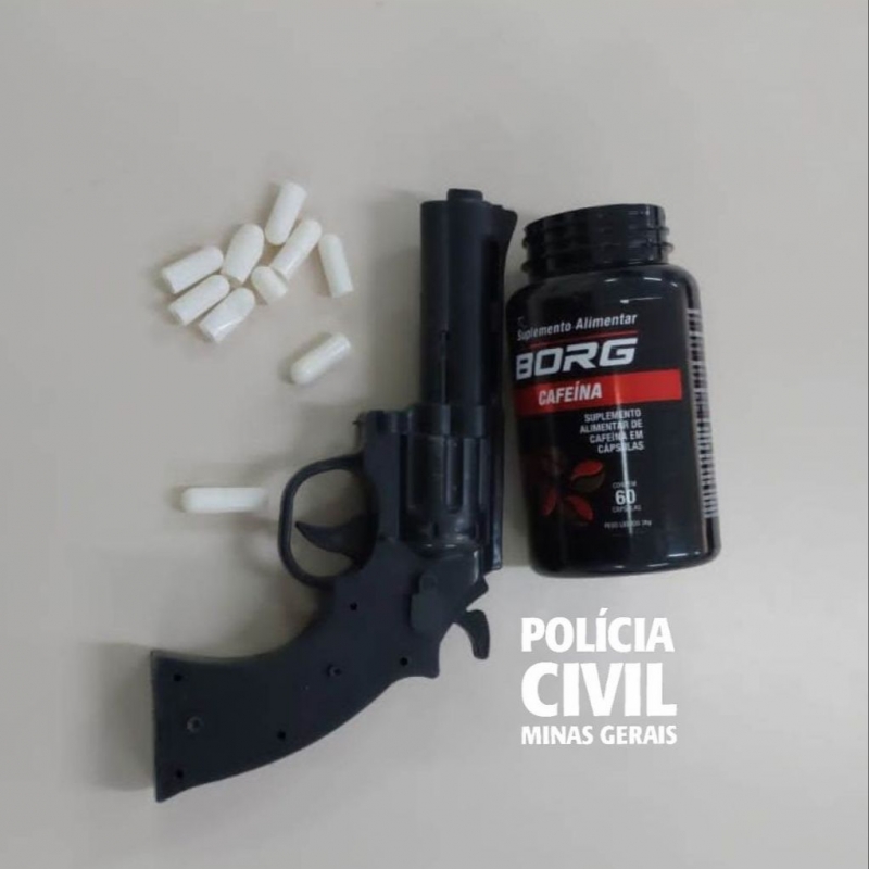 Na residência onde o investigado foi preso, mediante cumprimento de mandado de busca e apreensão, foram localizadas uma réplica de arma de fogo, um cigarro de maconha, dois dichavadores e várias cápsulas de cafeína (material comumente utilizado para embalar drogas).