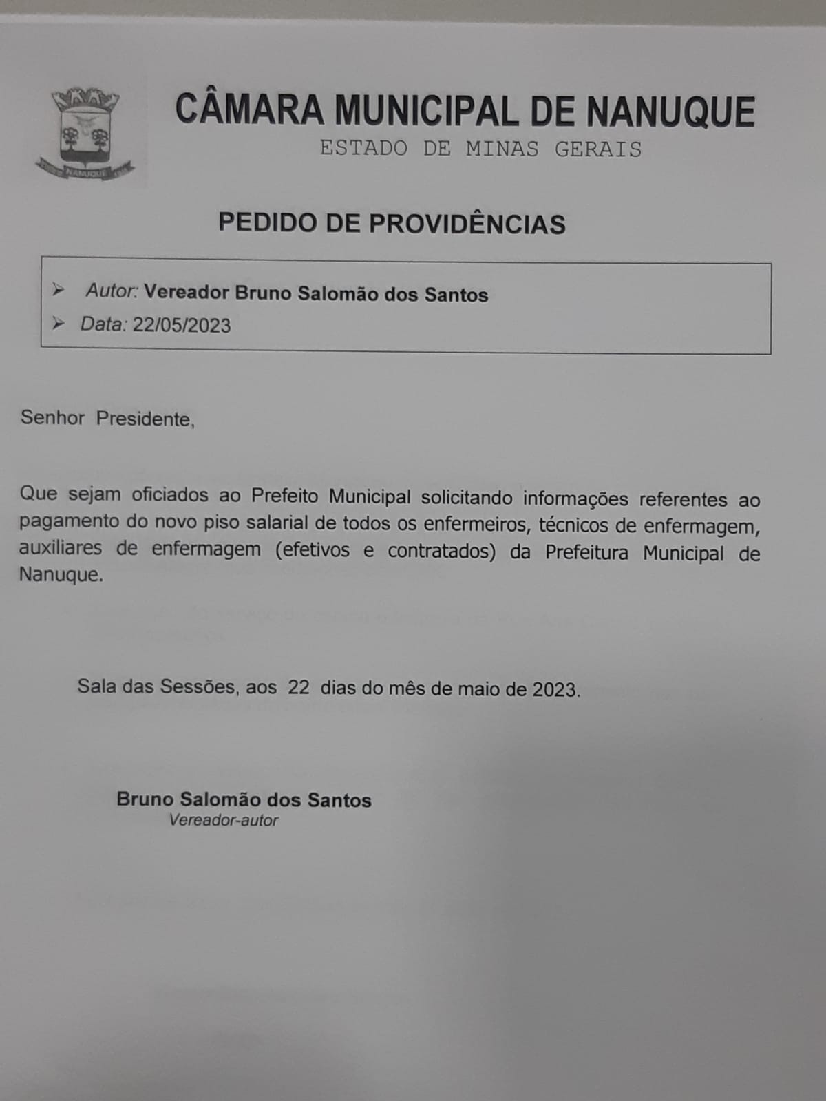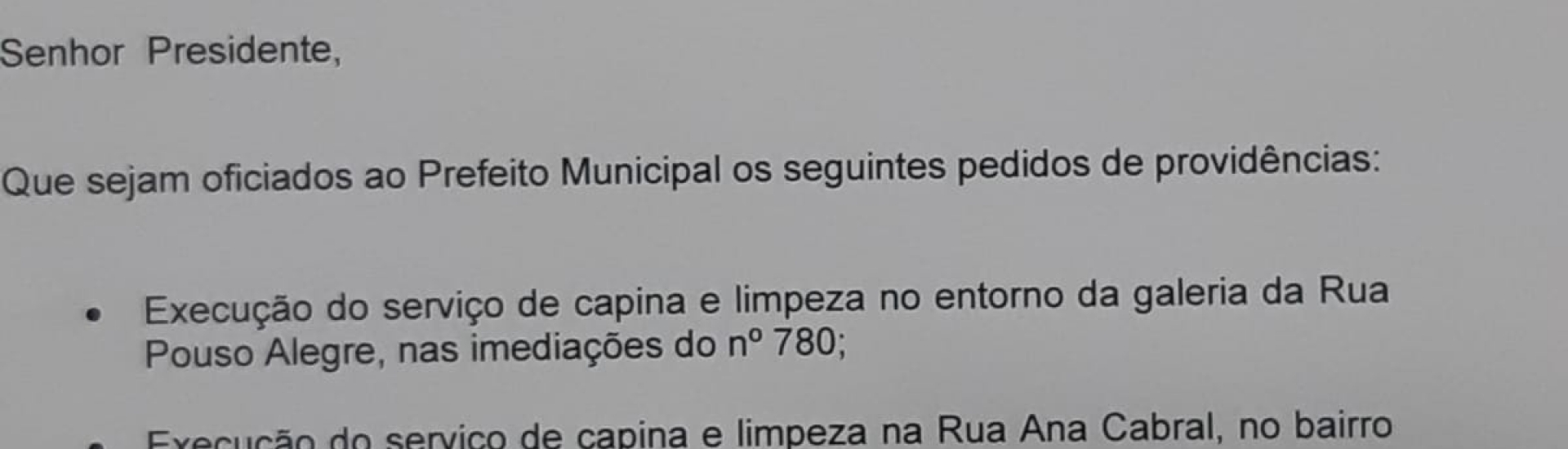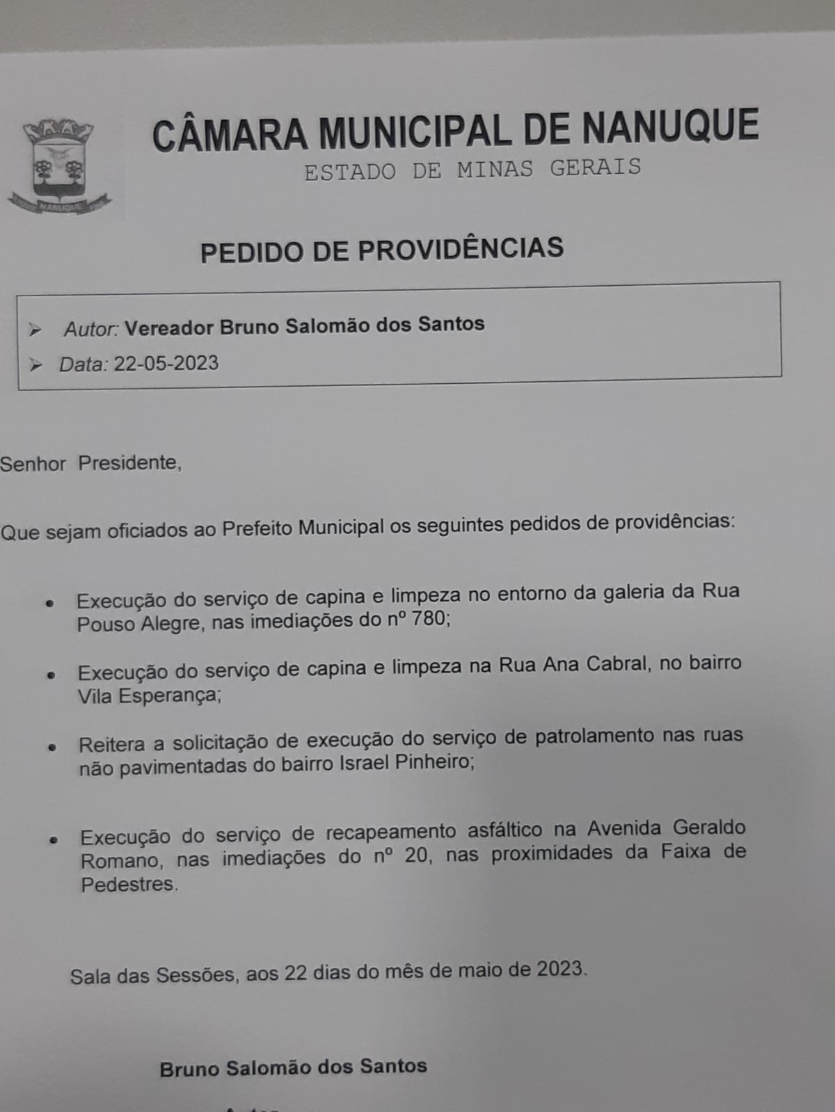 Nesse mês de Maio de 2023, dentre as indicações do vereador Bruno Salomão podemosdestacar os pedidos de providência de infraestrutura do município, visando asnecessidades de capina e limpeza no entorno da galeria da Rua Pouso Alegre, etambém a execução do serviço de capina e limpeza na Rua Ana Cabral no Bairro daVila esperança.