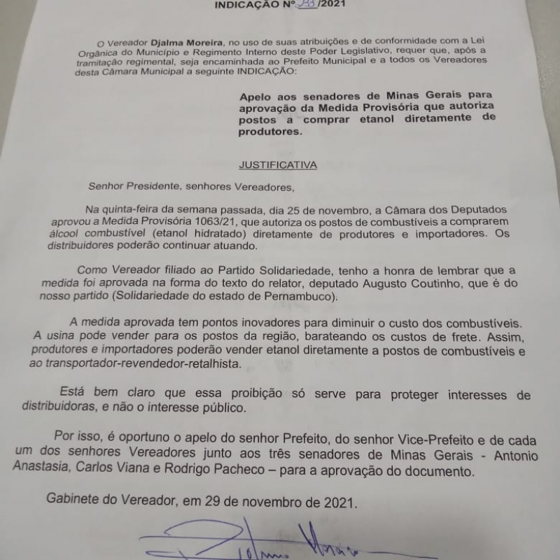 Nesse ano vigente, o etanol sofreu diversos aumentos de preço, superando a marca de 74% em relação ao mesmo período do ano passado. Além de exercer a função de vereador no município de Nanuque, Djalma Moreira também é funcionário de uma usina sucroalcooleira da região, devido a isso, o mesmo tem conhecimento prático da politica de compra e venda atual de etanol.