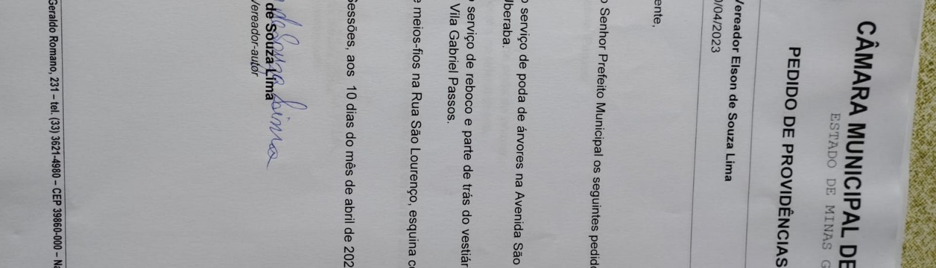 Conforme a Indicação (documento legislativo cujo objetivo é sugerir a outro Poder que adote providências, como o Presidente da Câmara de Vereadores, a quem foi citada na referida indicação) o vereador Elson Lima solicita que seja oficiados ao Prefeito Municipal a execução do serviço de poda de árvores na Av. São João Del Rey, esquina com rua Uberaba, e também o serviço de reboco e parte de trás do vestiário do campo de futebol do distrito de Vila Gabriel Passos.