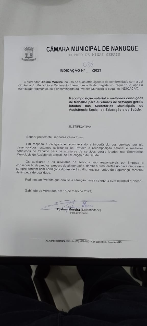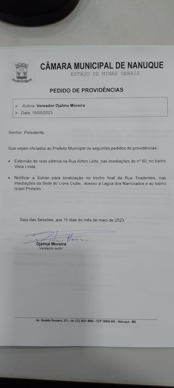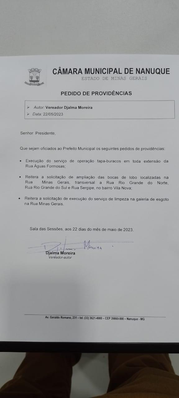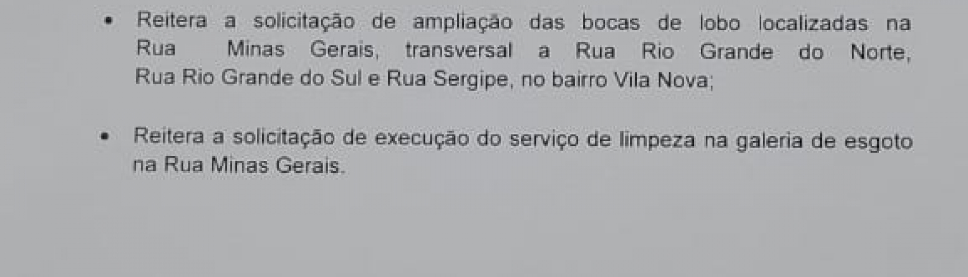 O Vereador Djalma Moreira solicitou a execução do serviço de operação Tapa Buracos em toda a extensão da Rua águas formosas, e também a solicitação de ampliação das bocas de lobo localizadas na rua Minas Gerais, transversal a rua Rio Grande do norte, Rua Grande sul e Rua Sergipe do Bairro Vila Nova.
