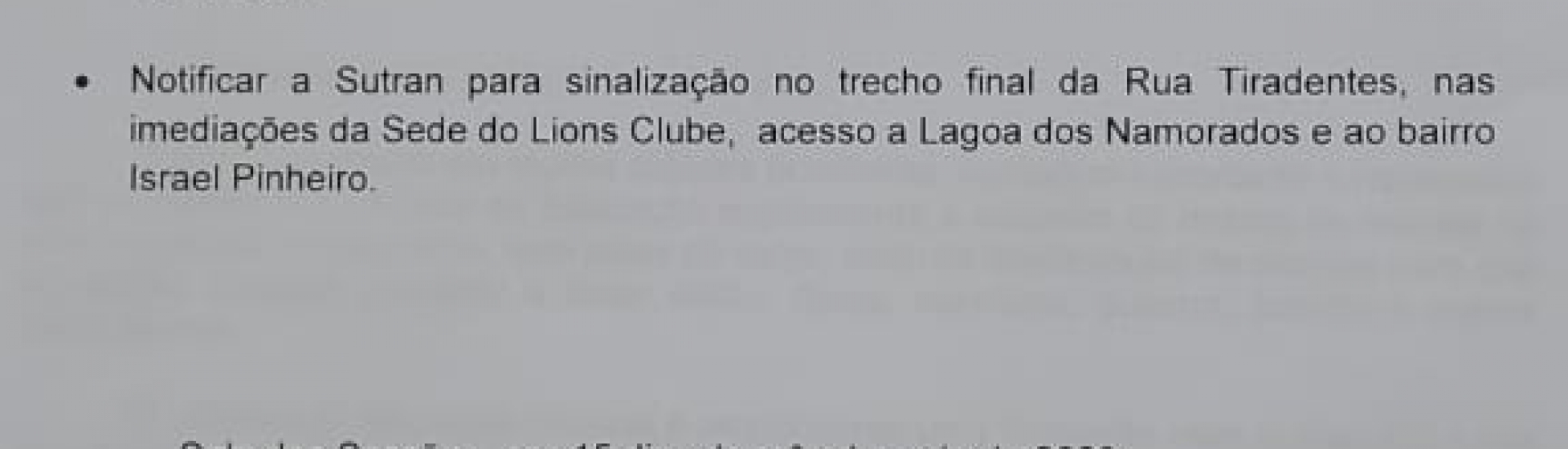 E notificar a sutran para sinalização no trecho final da rua Tiradentes , nas mediações da sede do lions clube, acesso a lagoa dos namorados bairro israel pinheiro.