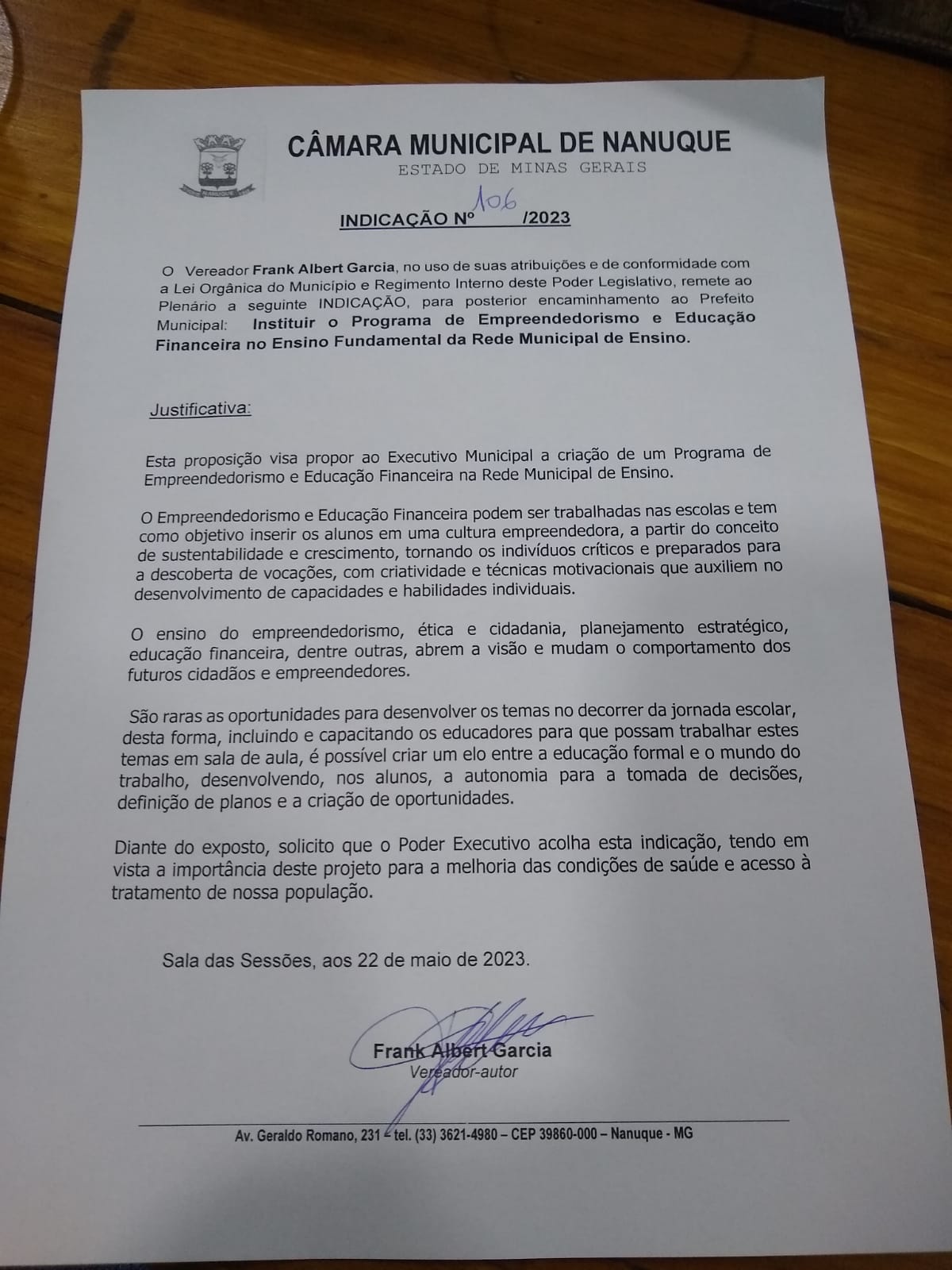 O Vereador Frank Albert Garcia, no uso de suas atribuições e de conformidade com a lei Orgânica do Município e Regimento interno deste poder legislativo, remete ao plenário a seguinte INDICAÇÃO , para posterior encaminhamento ao prefeito Municipal: Instituir o Programa de Empreendedorismo e Educação Financeira no Ensino Fundamental da Rede Municipal de Ensino .
