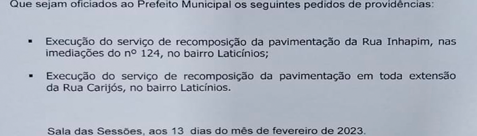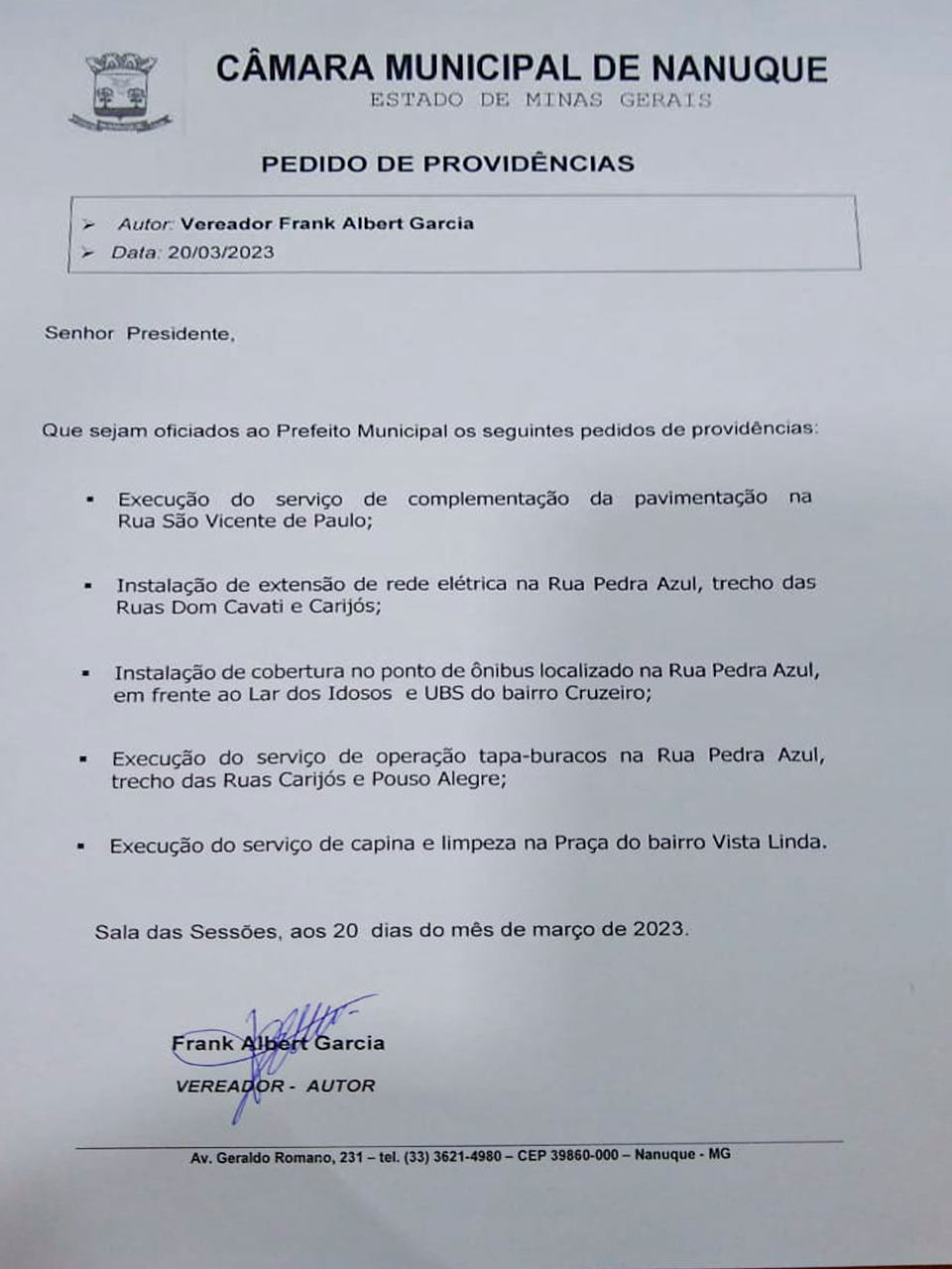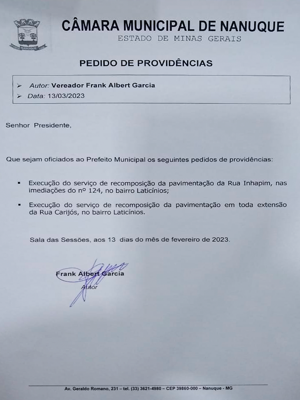 Em sua atuação como vereador e representante dos moradores de Nanuque como foi atribuído, o vereador Frank Albert Garcia solicita que seja feita a recomposição da pavimentação da rua Inhapim, nas imediações do nº 124, no bairro Laticínios, e também em toda extensão da rua Carijós, no bairro Laticínios. As obras de Recuperação de Pavimentação apresentam resultados efetivos na restauração de buracos, desnivelamento e demais imperfeições causadas pelo tráfego intenso de veículos pesados e ações climáticas, cujas obras tem sido constantemente cobrada pela população nanuquense.