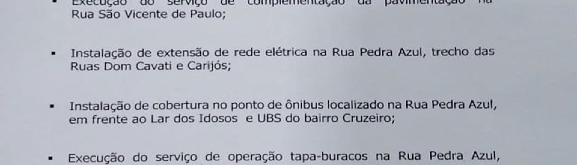 Inclui-se nas solicitações, a instalação de cobertura no ponto de ônibus localizado na rua Pedra Azul, em frente ao Lar dos Idosos e UBS do bairro Cruzeiro. A execução do serviço da operação tapa-buracos na rua Pedra Azul, trecho da rua Carijós e Pouso Alegre foram citados também para recuperar o pavimento desgastado naturalmente ou danificado após intervenções externas, permitindo assim, que motoristas e pedestres circulem pelo município com mais segurança.