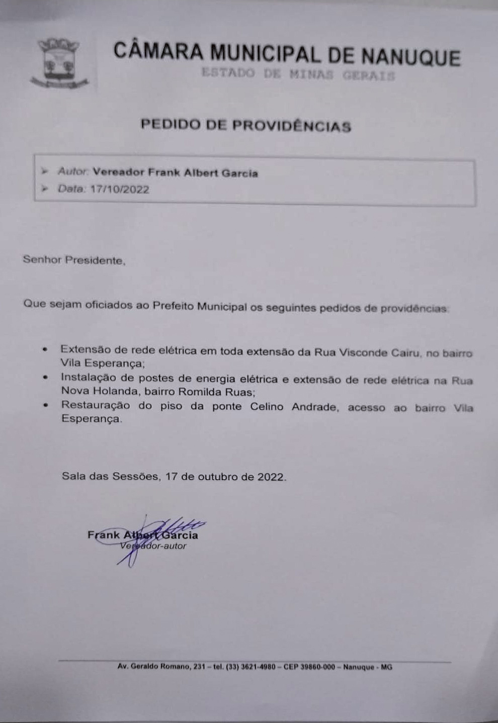 Dentre os pedidos de providências do mês de outubro, o vereador de Nanuque Frank Albert Garcia indica que, em toda estensão da rua Visconde Cairu, no bairro Vila Esperança, seja instalada uma ampliação da rede elétrica para que a energia chegue da melhor maneira possível aos consumidores dessa localidade. Isso porque são elas fornecem aos ocupantes da residência o acesso a eletricidade para realizar as tarefas do dia a dia. Portanto, conhecer a importância das instalações elétricas é essencial para que todo o sistema atue da melhor maneira possível e evite uma série de problemas ou até acidentes envolvendo eletricidade.