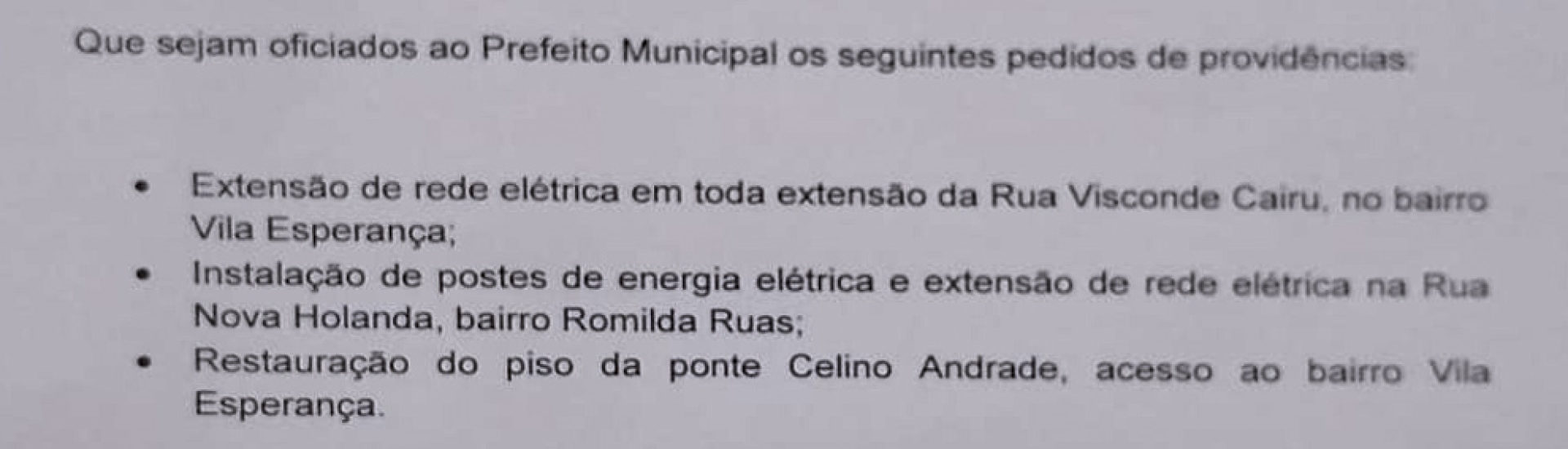Outra indicação, foi para que seja instalado postes de energia elétrica e extensão de rede elétrica na rua Nova Holanda, bairro Romilda Ruas. A vida cotidiana da maioria das pessoas depende amplamente da eletricidade, sendo notável a atividade elétrica nas residências.