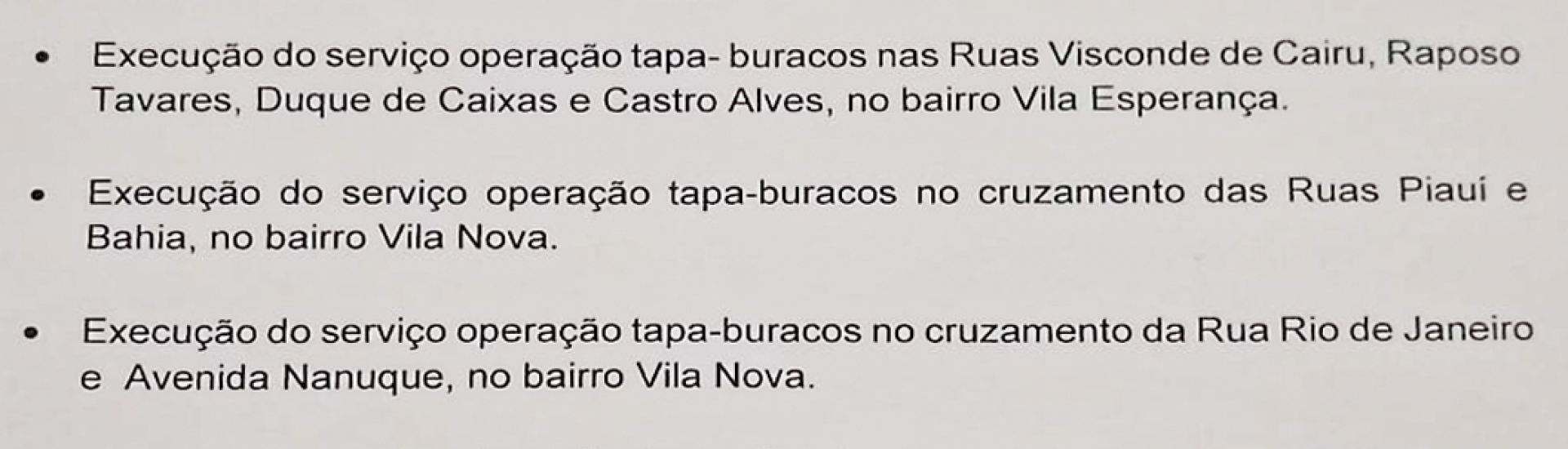 A solicitação inclui a execução do serviço de tapa-buracos nas seguintes localidades: rua Visconde de Cairu, Raposo Tavares, Duque de Caxias e Castro Alves situadas no bairro Vila Esperança; no cruzamento das ruas Piauí e Bahia e no cruzamento das ruas Rio de Janeiro e Avenida Nanuque situadas no bairro Vila Nova. As reclamações são infinitas e diárias, motoristas são forçados a desviar de buracos que resultam em pneus cortados, amortecedores estourados, rodas quebradas, sem mencionar o aumento das chances de que ocorram acidentes trágicos.