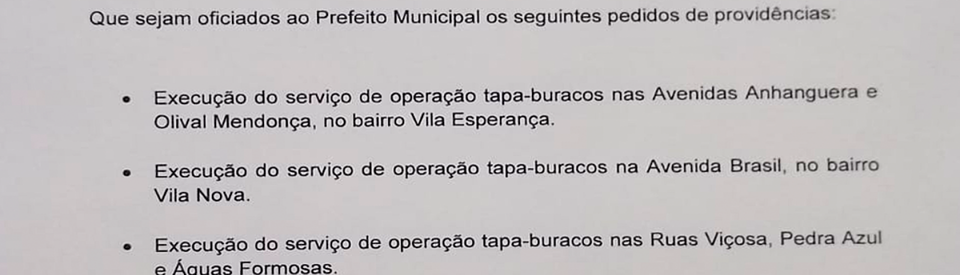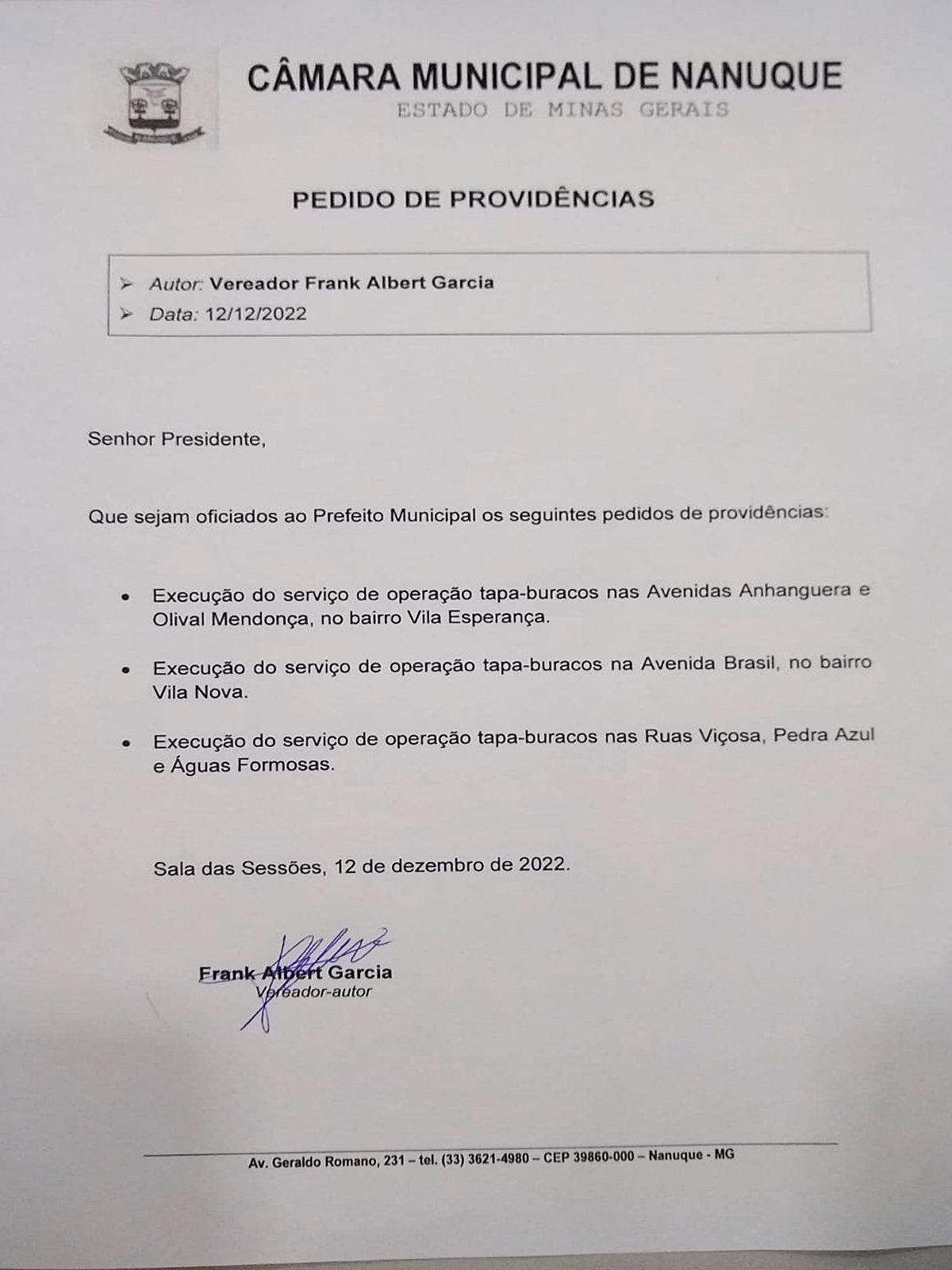 Para recomposição do pavimento, eliminando buracos e depressões em vias públicas, o vereador Frank Albert Garcia solicita que seja executado o serviço de "Tapa Buracos" na Av. Anhanguera e Olival Mendonça no bairro Vila Esperança, também na Av. Brasil no bairro da Vila Nova e nas ruas Viçosa, Pedra Azul e Águas Formosas. As reclamações são infinitas e diárias, motoristas são forçados a desviar de vários buracos, que resultam em pneus cortados, amortecedores estourados, rodas quebradas, sem mencionar o aumento das chances de que ocorram acidentes trágicos.