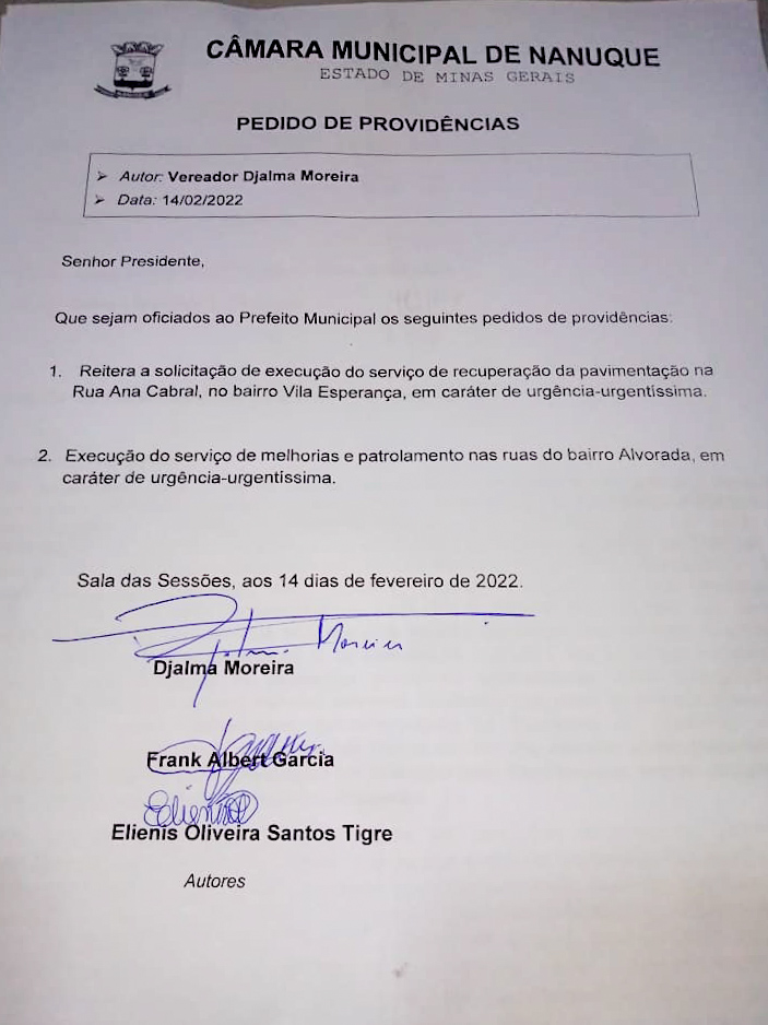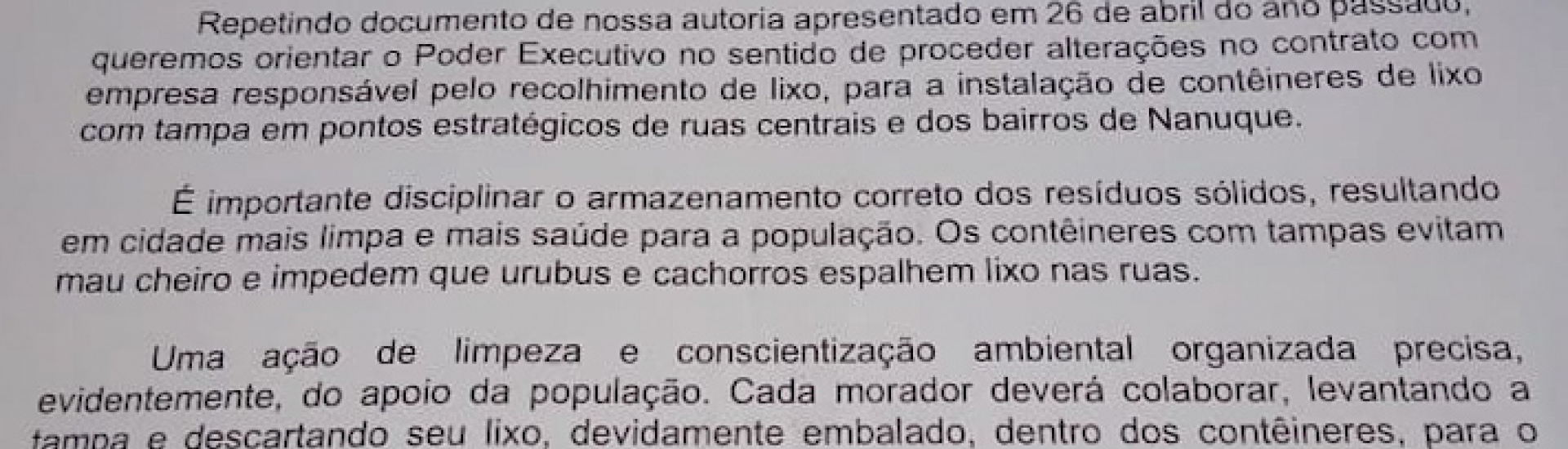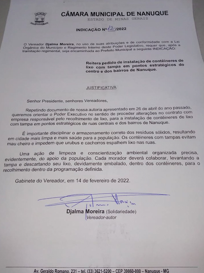 Ainda na segunda-feira dia 14 de fevereiro, o vereador Djalma Moreira emite a solicitação para instalação de contêineres de lixo com tampa em pontos estratégicos do centro e dos bairros de Nanuque. Destacando a importância do armazenamento correto dos resíduos sólidos e do apoio da população. Os contêineres com tampas evitam mau cheiro e impedem que urubus e cachorros espalhem lixo nas ruas, cada morador deverá colaborar, levantando a tampa e descartando seu lixo devidamente embalado, dentro dos contêineres, para o recolhimento dentro da programação definida, conforme diz solicitação.