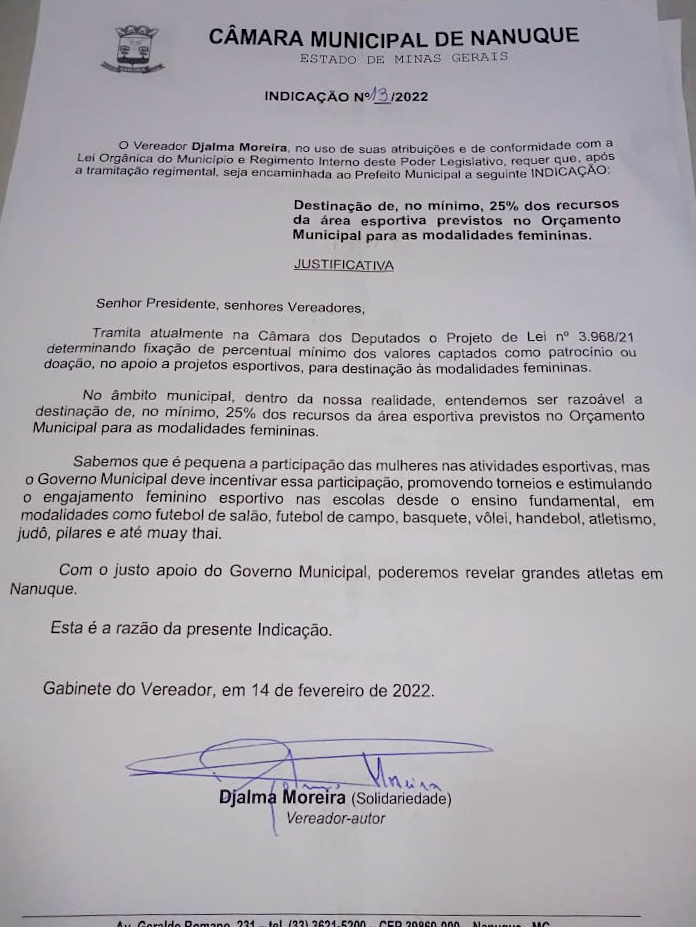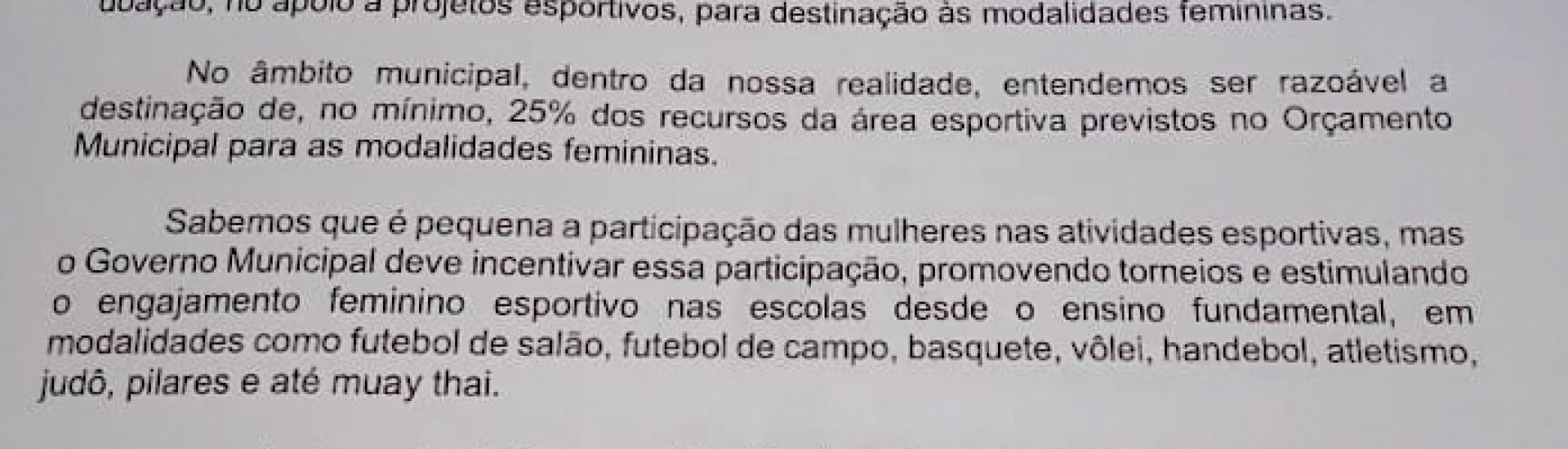 O vereador também indica a destinação de, no mínimo, 25% dos recursos da área esportiva previstos no Orçamento Municipal para as modalidades femininas. Objetivando incentivar a participação das mulheres nas atividades esportivas, promovendo torneios e estimulando o engajamento feminino esportivo nas escolas desde o ensino fundamental, em modalidades como futebol de salão, futebol de campo, basquete, vôlei, handebol, atletismo, judô, pilares e até muay thai.