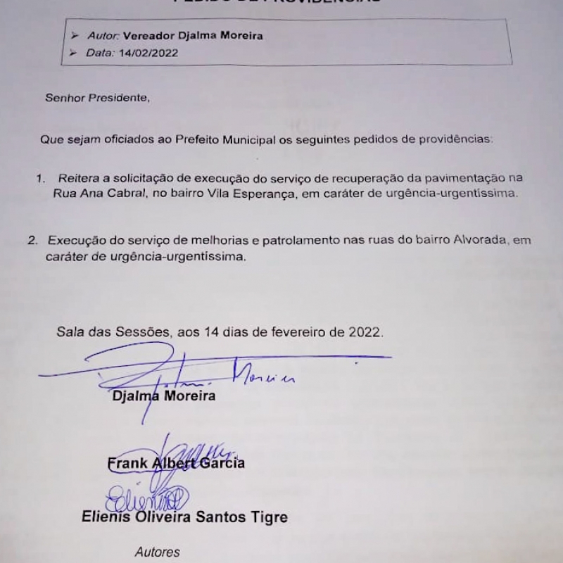 O vereador Djalma Moreira juntamente com o vereador Frank Albert Garcia solicitam, na segunda-feira dia 14 de fevereiro, a execução do serviço de recuperação da pavimentação na Rua Ana Cabral, no bairro Vila Esperança, melhorias e patrolamento nas ruas do bairro Alvorada, em caráter de urgência.
