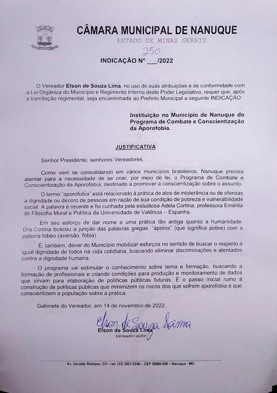 Visando combater a aversão aos pobres e suas implicações na democracia, o veredor indica criar o Programa de Combate e Conscientização da Aporofobia. O termo designa a prática de atos de intolerância ou de ofensas à dignidade ou decoro de pessoas em razão de sua condição de pobreza e vulnerabilidade social.