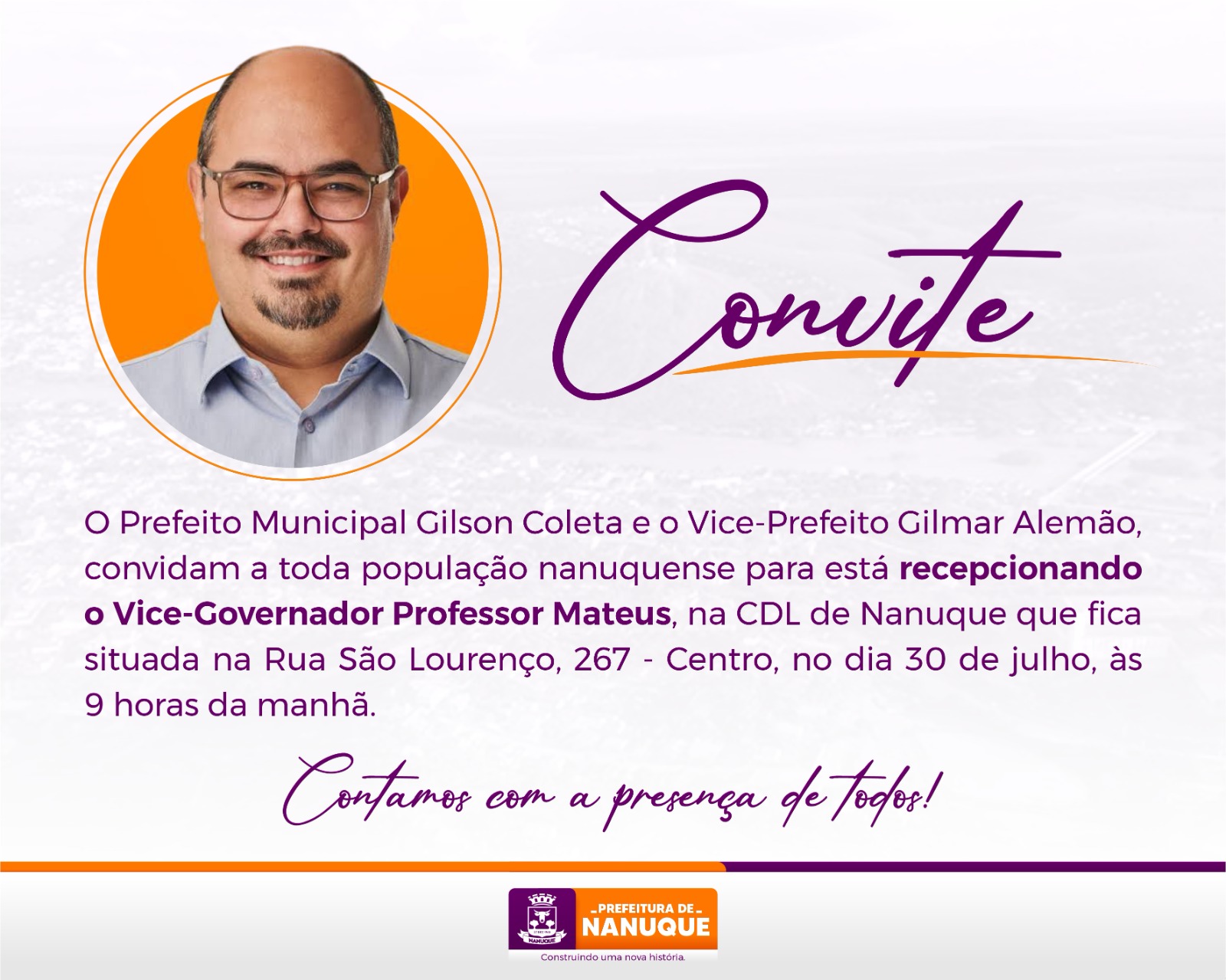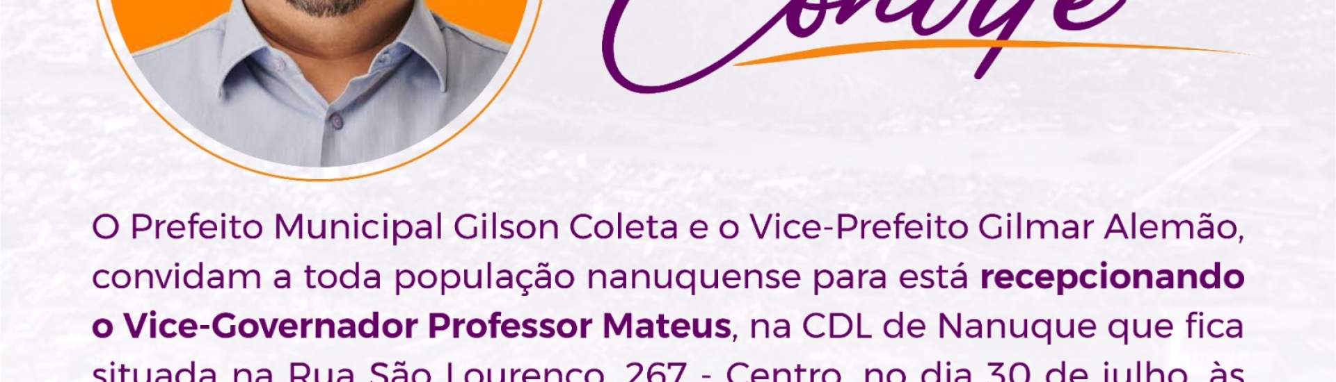 Na manhã deste sábado (29), foi veiculado através das mídias da prefeitura municipal de Nanuque-MG um convite, cujo o qual convidam a população para recepcionar o atual vice-governador de Estado Professor Mateus (Novo).