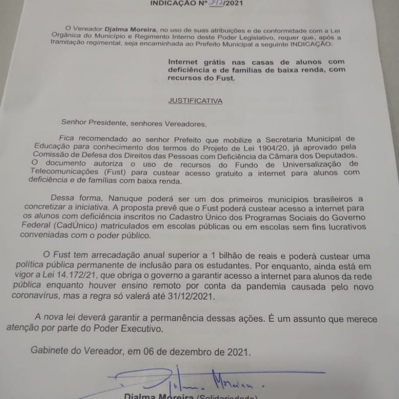 Em sessão ordinária, realizada na segunda-feira (06/12), o vereador Djalma Moreira entrou com a indicação nº 242/2021, para que alunos integrantes de famílias carentes e alunos portadores de deficiência tenha acesso a internet gratuita no município de Nanuque.