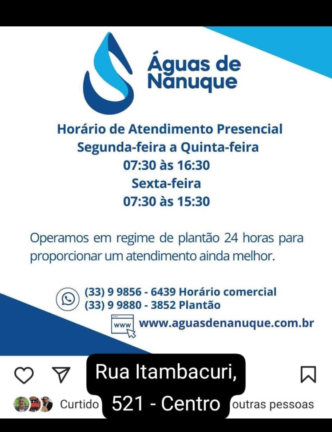 A nova empresa, Águas de Nanuque, já informou seu horário de atendimento presencial e números para contato (imagem ao abaixo). A população, por sua vez, tem opiniões divergentes sobre essa transição. Nossa equipe está em contato com os moradores e ambas as empresas para obter pronunciamentos sobre essa significativa mudança no serviço de saneamento básico da cidade. Fique ligado para mais informações.