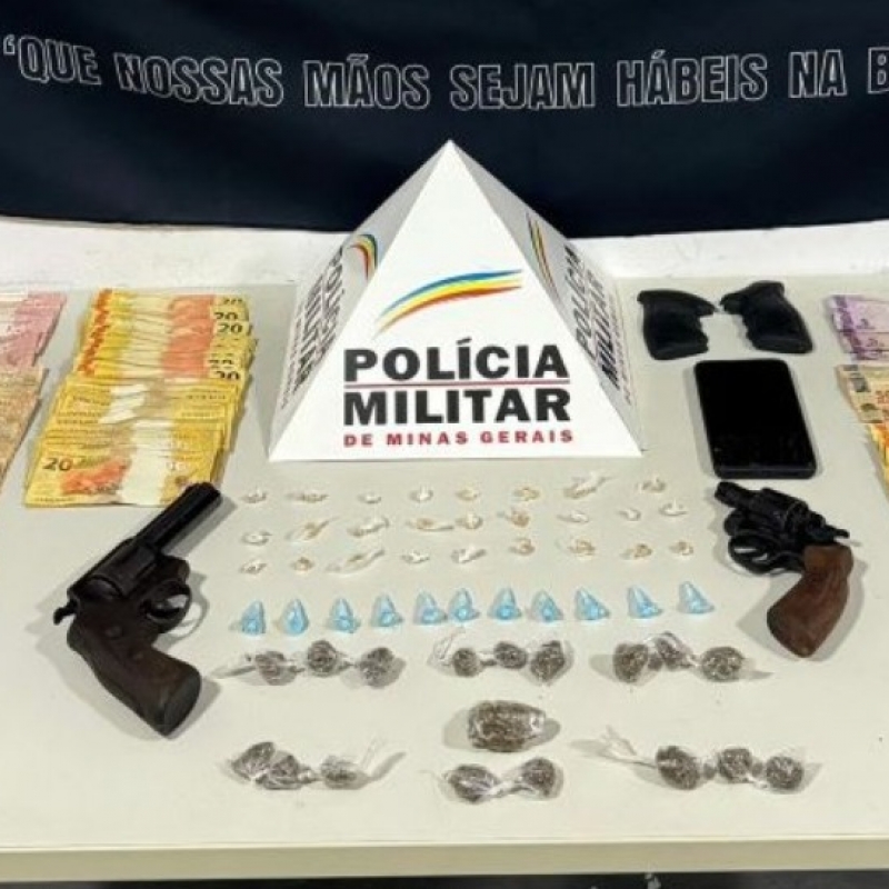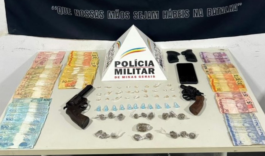 Durante a busca no lote, as equipes encontraram substâncias ilícitas, o que levou ao flagrante e, com o apoio da radiopatrulha, a abordagem da residência. No imóvel, mais drogas foram localizadas, além de armas de fogo e dinheiro, caracterizando o envolvimento dos suspeitos no tráfico.