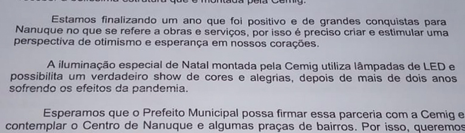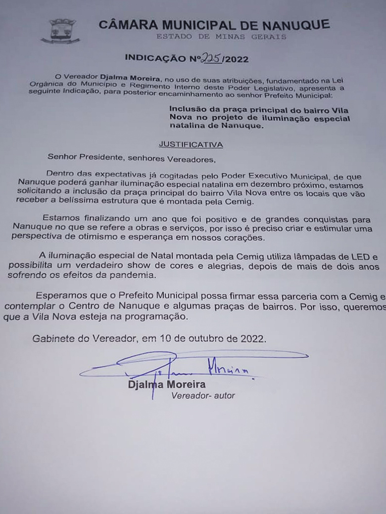 Solicita também, a inclusão da praça principal do bairro Vila Nova no projeto de iluminação especial natalina de Nanuque, para que, em dezembro a localidade também faça parte dessa prática anual de iluminação pública da cultura brasileira e mundial.