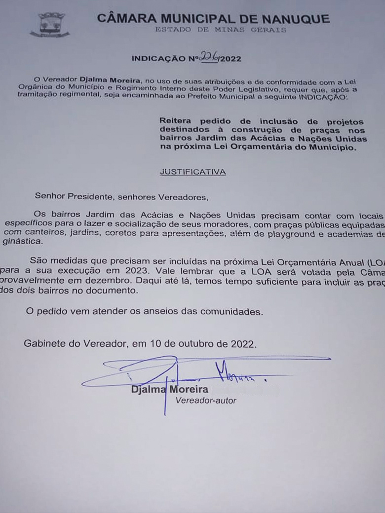 No uso de suas legais e regimentais atribuições o vereador também apresenta a indicação que propõe inclusão de projetos destinados à construção de praças nos bairros Jardim da Acácias e Nações Unidas na próxima Lei Orçamentária do Município. Visando abranger mais locais específicos para o lazer e socialização de seus moradores, com praças públicas equipadas com canteiros, jardins, coretos para apresentações, além de playground e academias de ginástica. Medidas essas que precisam ser incluídas na próxima Lei Orçamentária Anual para sua execução em 2023.