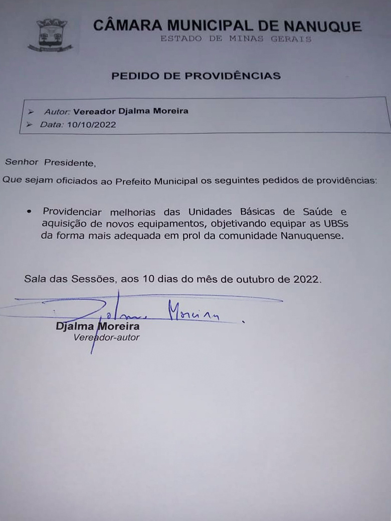 Visando as necessidades do município o veredor Djalma Moreira solicita que sejam providenciadas melhorias das Unidades Básicas de Saúde e aquisição de novos equipamentos, objetivando equipar as UBSs da forma mais adequada em prol da comunidade Nanuquense.