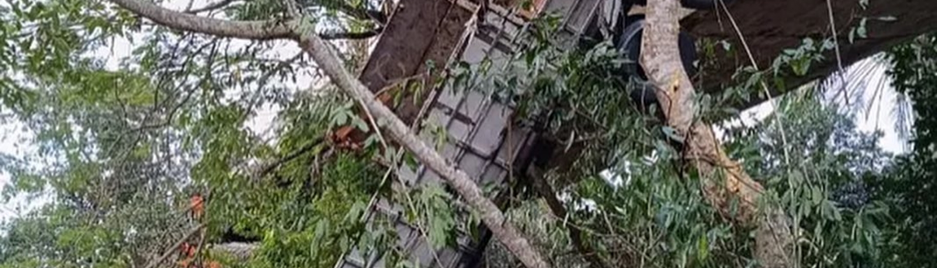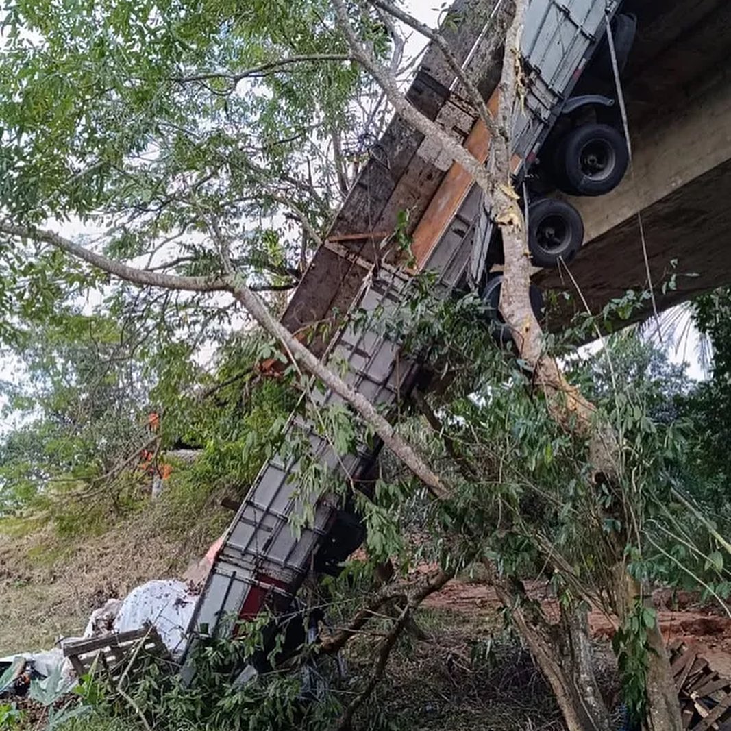 A carreta que causou o segundo acidente ficou pendurada na ponte. Havia duas pessoas no veículo, mas não há informações sobre o estado de saúde delas.