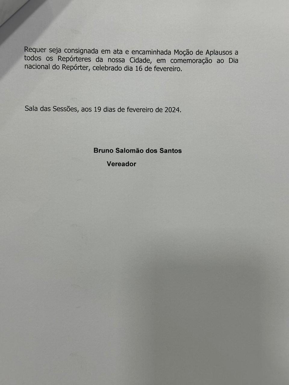 9- Requerimento de Moção de Aplausos a todos os Repórteres da cidade em comemoração ao Dia Nacional do Repórter, celebrado em 16 de fevereiro.