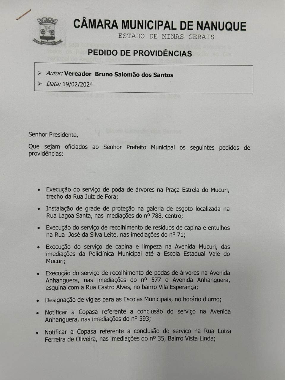 O vereador Bruno Salomão destaca a importância dessas demandas para a melhoria da qualidade de vida dos munícipes e reafirma seu compromisso em representar os interesses da população de Nanuque.