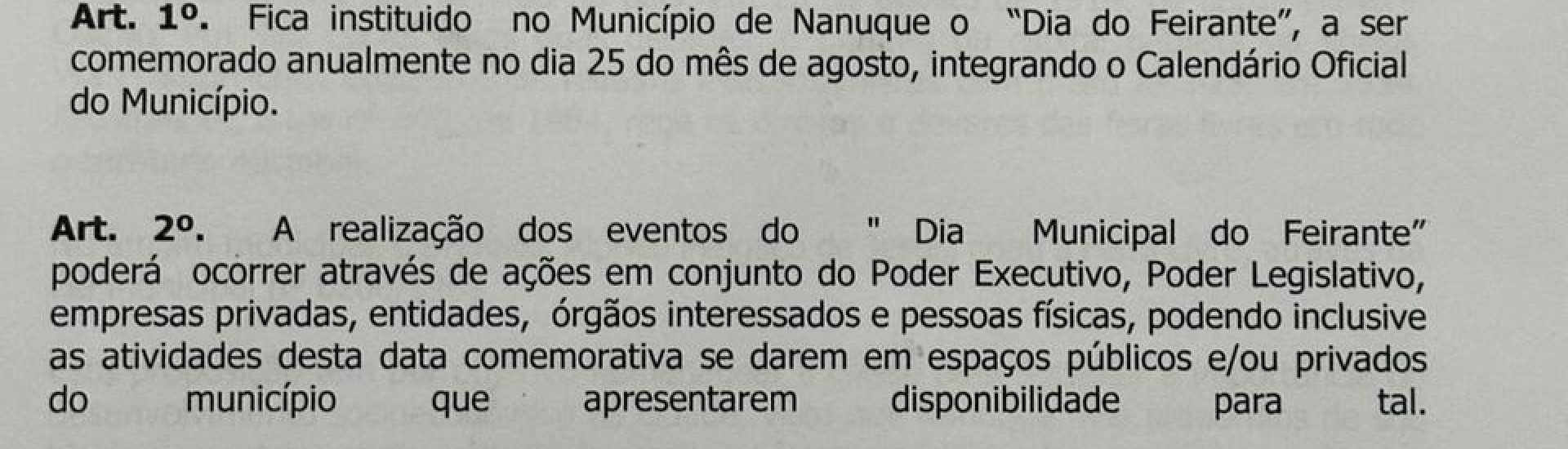 Projeto de Lei: Instituição do "Dia do Feirante" em Nanuque