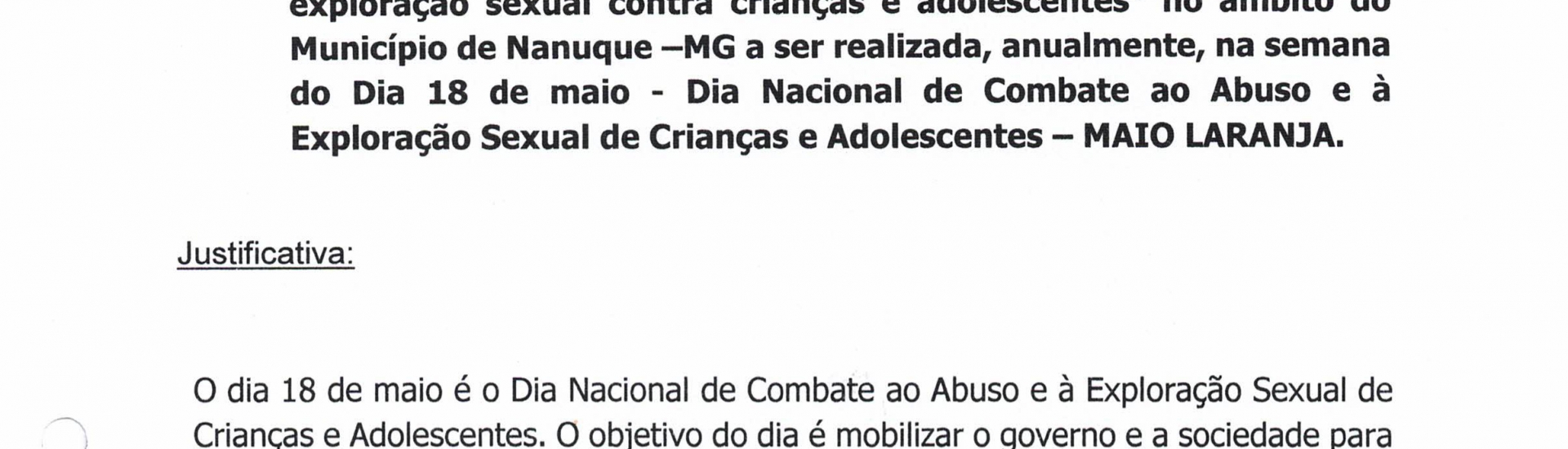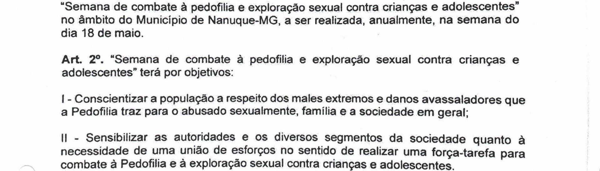 O vereador requereu ao Plenário uma indicação para o estabelecimento de um cronograma de ações relacionadas ao combate e prevenção da pedofilia, violência e abuso sexual contra crianças e adolescentes em Nanuque, em conformidade com a Lei Municipal nº 2.617/2022. Esta lei institui no calendário oficial do município a "Semana de Combate à Pedofilia e Exploração Sexual Contra Crianças e Adolescentes", a ser realizada anualmente na semana do Dia 18 de maio, Dia Nacional de Combate ao Abuso e à Exploração Sexual de Crianças e Adolescentes .