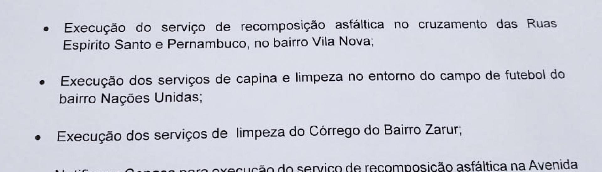Também indica serviços de capina e limpeza no entorno do campo de futebol do bairro Nações Unidas, e limpeza também do Córrego do Bairro Zarur. Com o objetivo de limpar as referidas áreas urbanas, otimizando o aproveitamento dos espaços.