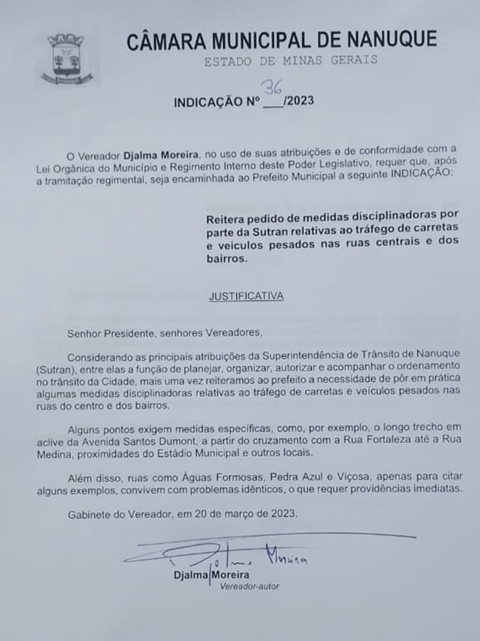 Ao trânsito foi enfatizado a importância de medidas disciplinadoras por parte da Sutran (Superintendência de Trânsito de Nanuque) relativas ao tráfego de carretas e veículos pesados nas ruas centrais e dos bairros. Cuja função da mesma é planejar, organizar, autorizar e acompanhar o ordenamento no trânsito da cidade, e tem sido notável a importância desse olhar ao trânsito de veículos pesados nas ruas da cidade. Essas localidades incluem o trecho em aclive da Avenida Santos Dumont, a partir do cruzamento com a rua Fortaleza até a rua Medina, proximidades do estádio municipal dentre outros locais.