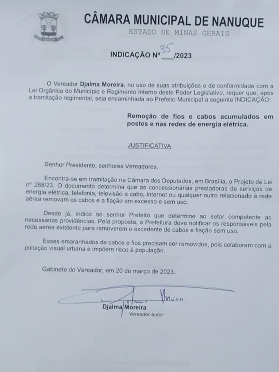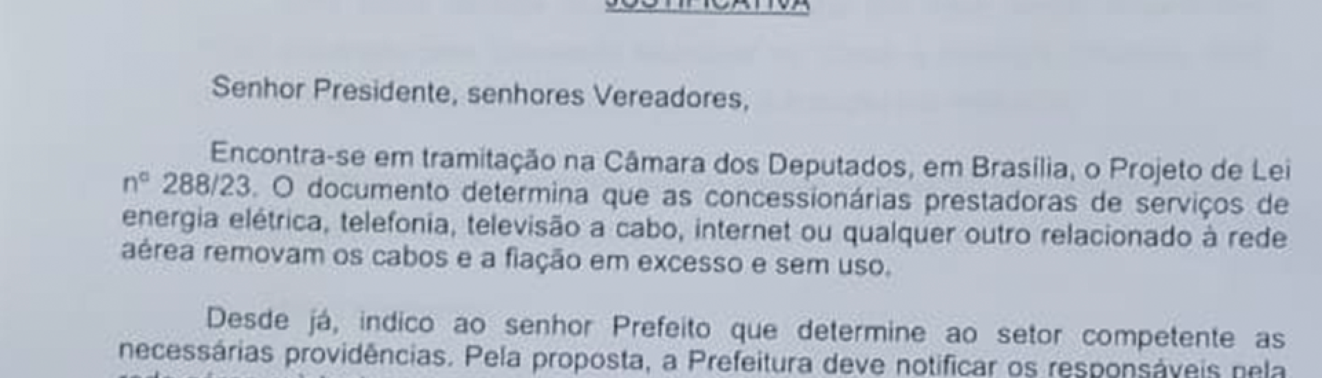 Ainda visando a organização e o cuidado pela cidade o vereador indica que seja removido os fios e cabos acumulados em postes e na redes de energia elétrica. Esse é um projeto de lei que encontra-se em tramitação na Câmara dos Deputados em Brasília para que as concessionárias prestadoras de serviços de energia elétrica, telefonia, televisão a cabo, internet ou qualquer outro relacionado à rede aérea removam os cabos e a fiação em excesso e sem uso.
