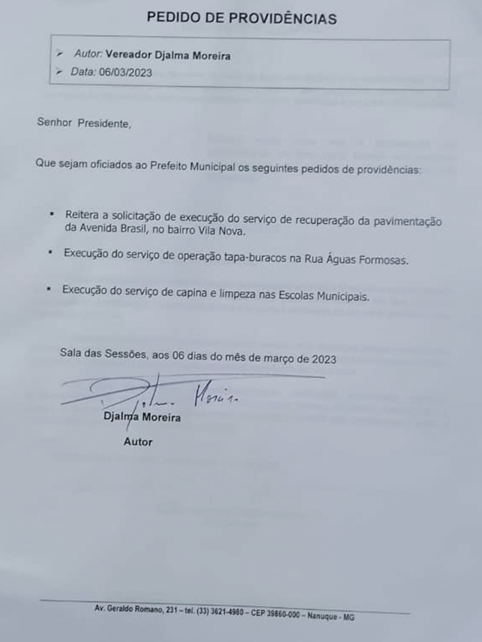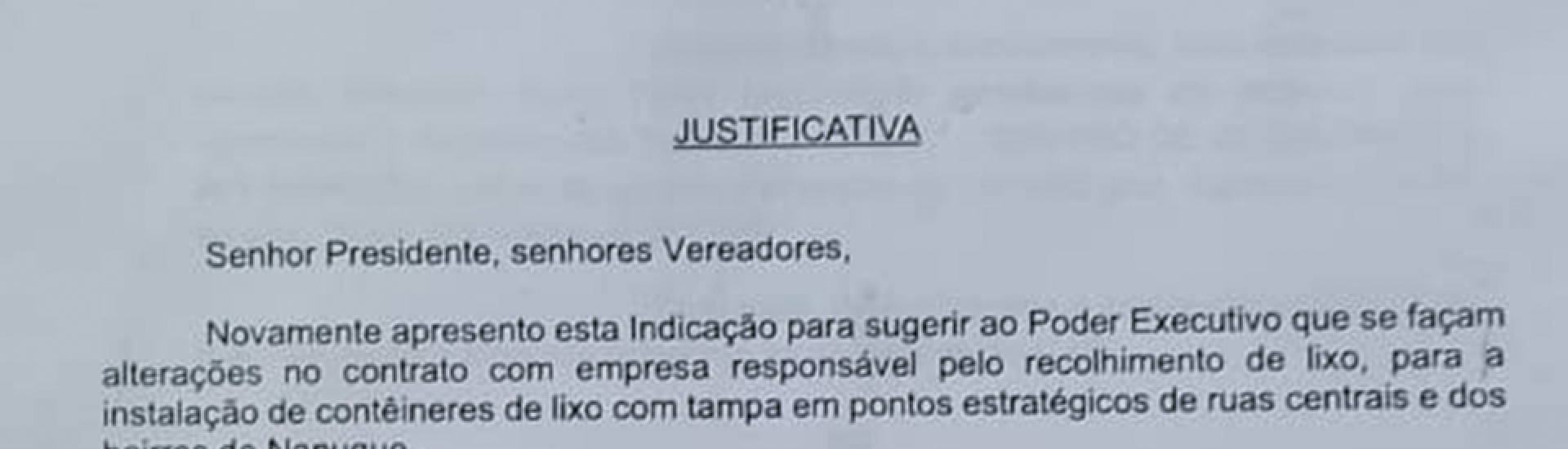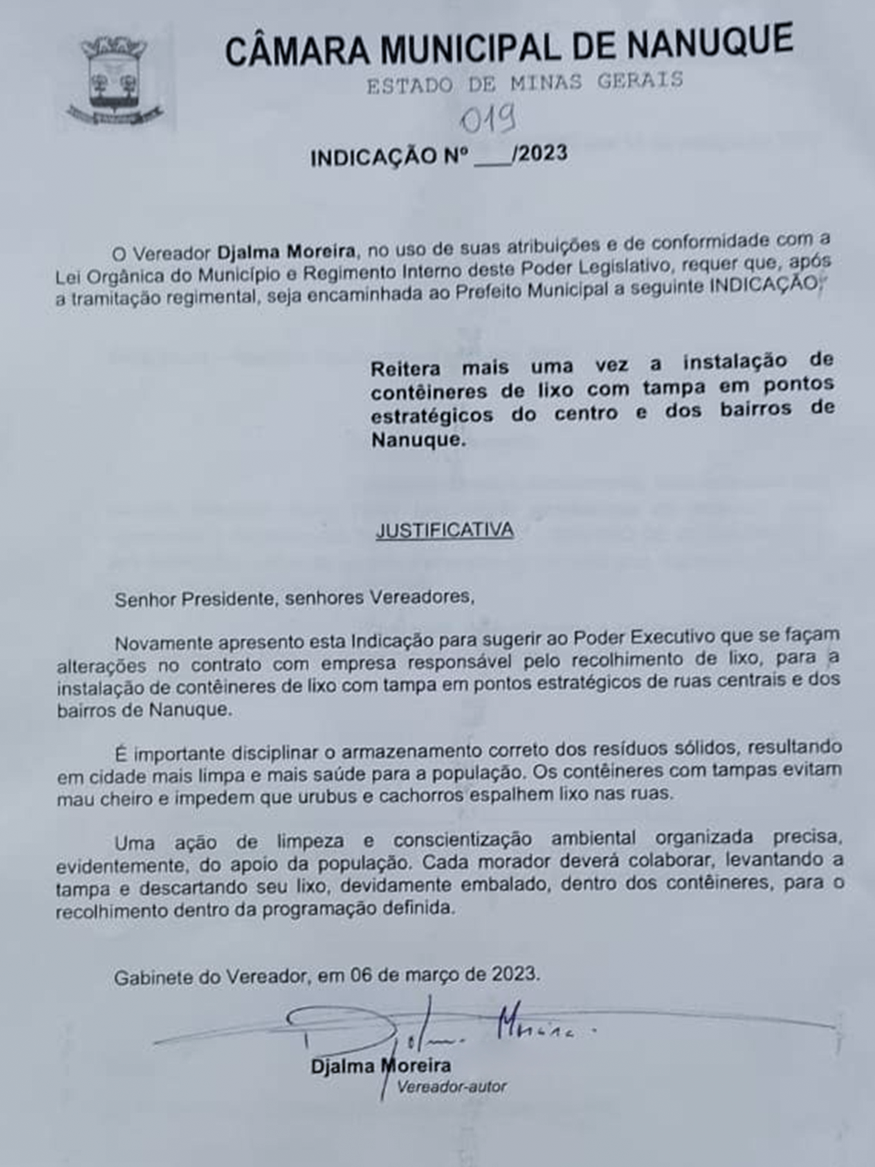 Para limpeza do município o vereador Djalma Moreira solicita ao poder executivo que seja feita alterações no contrato com a empresa responsável pelo recolhimento de lixo, para que seja instalado contêineres de lixo com tampa em pontos estratégicos do centro e nos bairros de Nanuque, para que seja armazenado de forma correta os resíduos sólidos, resultando em uma cidade mais limpa e mais saúde para a população.