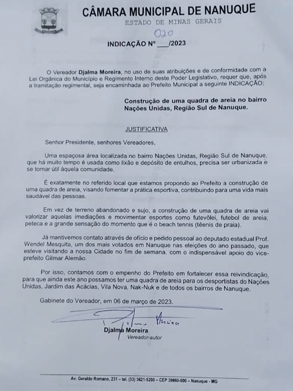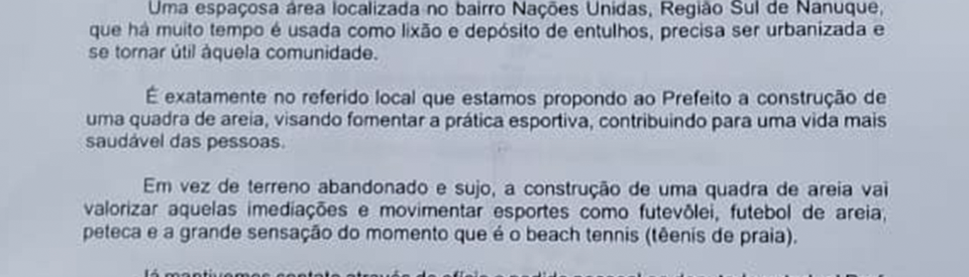 Na área do esporte o vereador solicita que seja construído uma quadra de areia no bairro Nações Unidas, região sul de Nanuque MG. O objetivo é aproveitar a área que tem sido usada erroneamente como lixão e depósito de entulhos, e torna-la útil à comunidade contribuindo também para a prática esportiva.