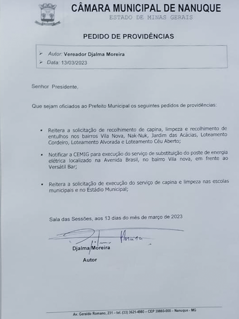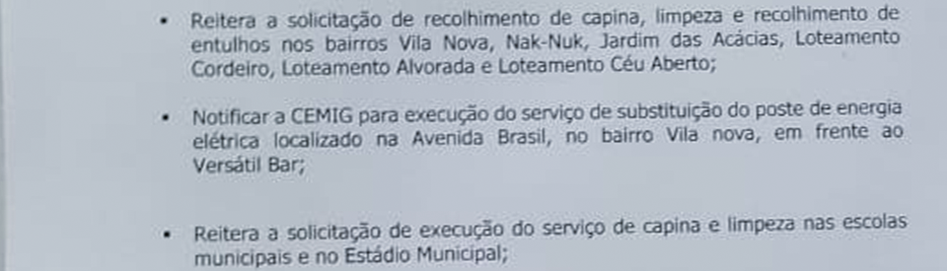 Na área urbana o vereador indicou que fosse feito o recolhimento de capina, limpeza e recolhimento de entulhos nos bairros Vila Nova, Nak Nuk, Jardim das Acácias, Loteamento Cordeiro, Loteamento Alvorada e Loteamento Céu Aberto, e também foi solicitado o serviço de capina e limpeza nas escolas municipais e no estádio municipal. Visando a necessidade de troca de poste de energia elétrica localizado na Avenida Brasil localizado no bairro Vila Nova, em frente ao Versátil Bar, o vereador solicita que uma notificação fosse feita a empresa CEMIG, Companhia Energética de Minas Gerais atuante em Nanuque.