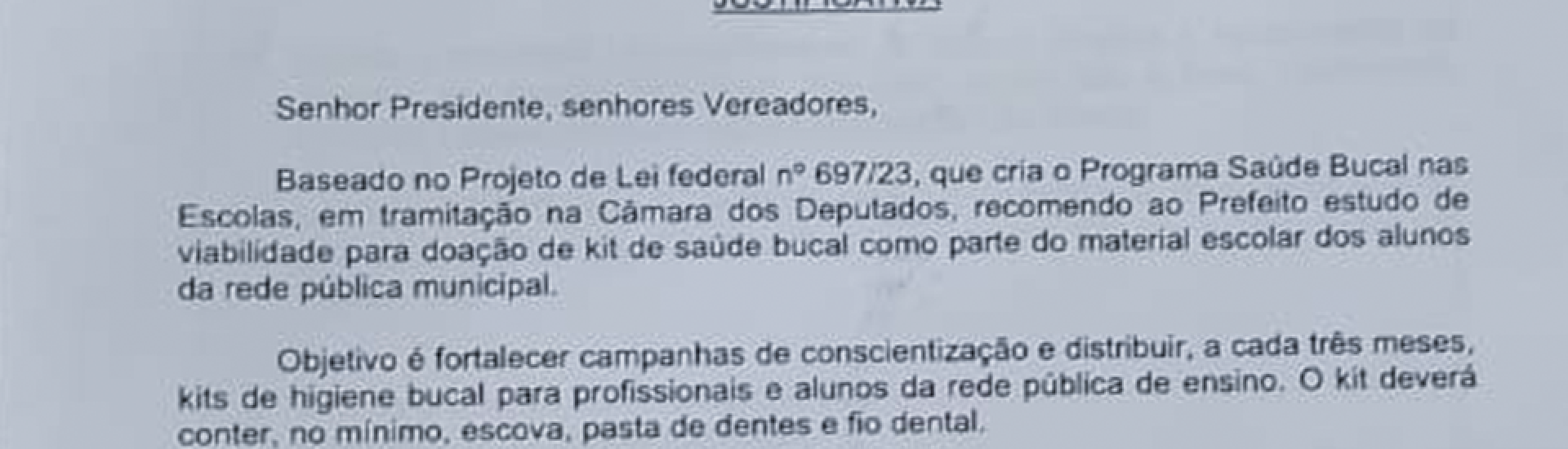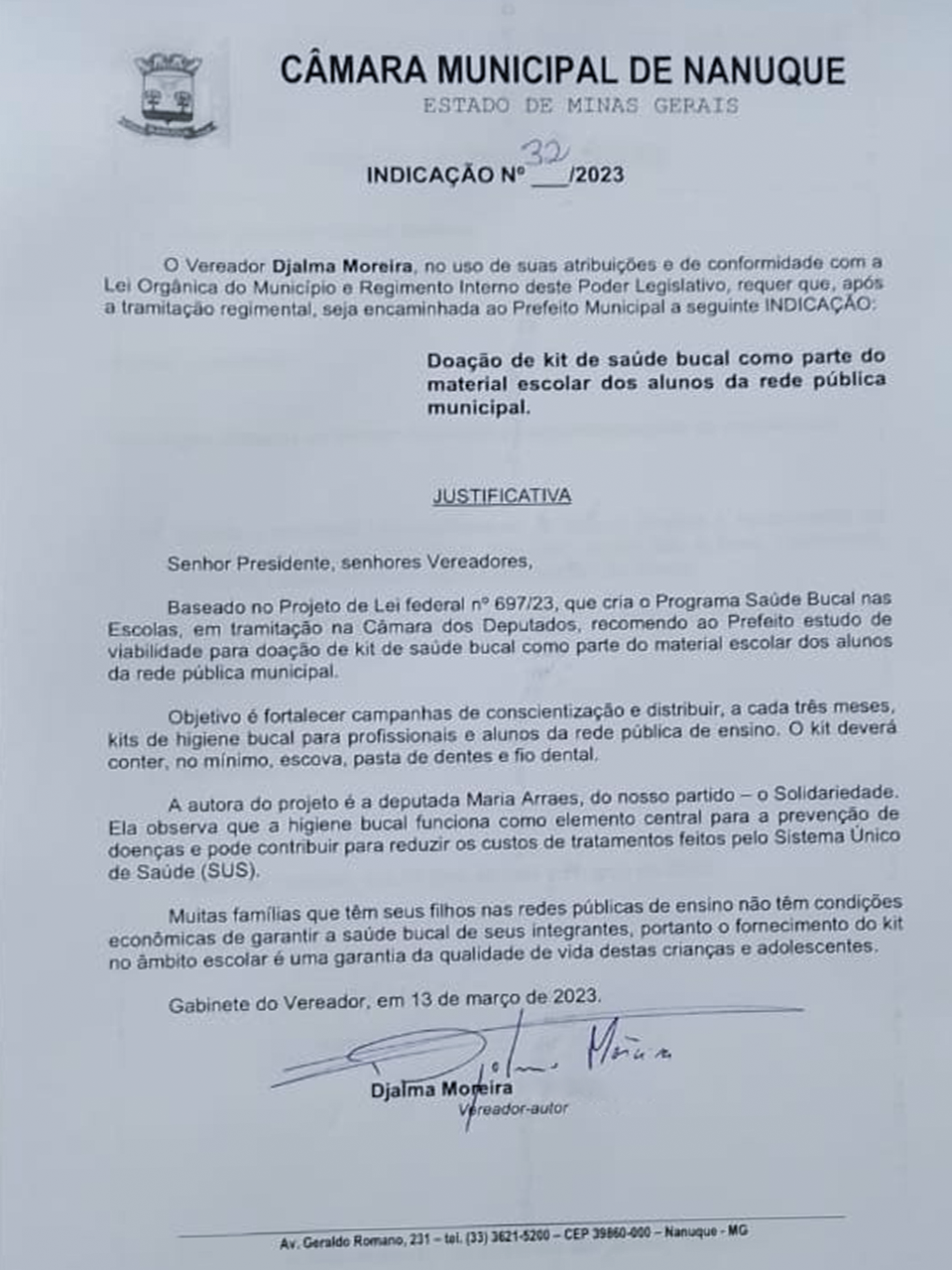 O Vereador Djalma Moreira apresentou diversas indicações a fim de que medidas sejam adotadas para melhorias do município de Nanuque em diversos aspectos incluindo na área da saúde, solicitando que seja feita doação de kit de saúde bucal como parte do material escolar dos alunos da rede pública municipal. Indicação baseada no projeto de lei federal nº 697/23, que cria o Programa Saúde Bucal nas Escolas, em tramitação na Câmara dos Deputados, o vereador recomenda ao Prefeito que estude a viabilidade para doação de kits de saúde bucal como parte do material escolar dos alunos da rede pública municipal, objetivando fortalecer campanhas de conscientização e distribuir, a cada três meses, kits de higiene bucal para profissionais e alunos da rede pública de ensino.