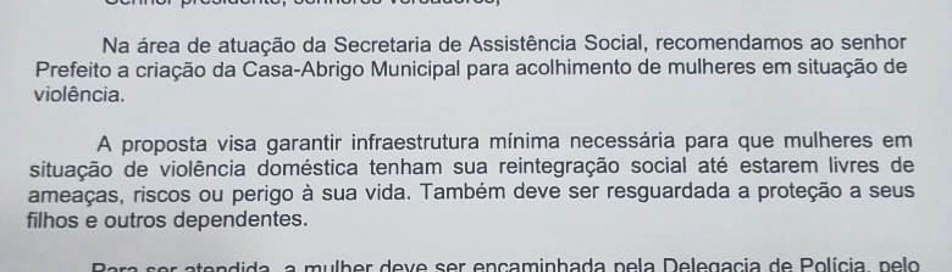 O vereador recomendou que seja criada uma Casa-Abrigo Municipal para acolhimento de mulheres em situação de violência. Essa indicação para área de atuação da Secretaria de Assistência Social leva à um debate considerando garantir uma infraestrutura mínima necessária para que mulheres, acompanhadas ou não de seus filhos, em situação de ameaça ou risco de morte em razão da violência doméstica ou familiar, causadora da lesão, sofrimento físico, sexual, psicólogico ou dano moral, para que tenham sua reintegração social até estarem livres de ameaças, riscos ou perigoso à sua vida.