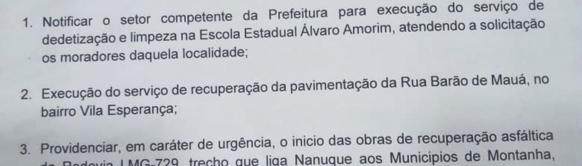 O vereador Djalma Moreira fez indicações na Câmara Municipal de Nanuque na qual inclui que sejam oficiados ao Prefeito Municipal a execução do serviço de recuperação da pavimentação em toda extensão da rua Dom Cavati, da rua São Vicente de Paulo esquina com Rua Medina, e também o serviço de nivelamento e pavimentação no trecho que compreende a rua Nelson Saraiva esquina com Alpheu Melgaço, no bairro Jardim das Acácias.