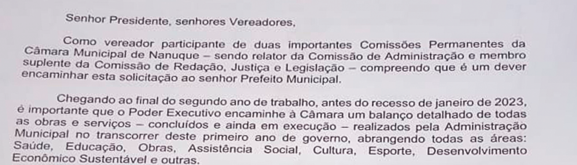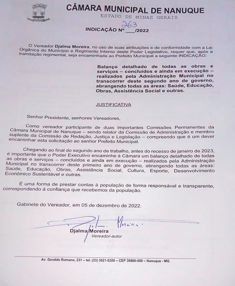 Para controle e melhor fiscalização, o vereador indica que seja feito um relatório das obras feitas e das que se encontram em execução pela administração municipal de Nanuque.no transcorrer deste segundo ano de governo no que diz respeito as áreas de saúde, educação, cultura, esporte, obras, assistências sociasis e demais feitos. Esse pedido visa prestar contas à população de forma responsásvel e transparente. Chefes do executivo têm a função de administrar os recursos e os bens públicos, nesse cenário é esperado que os recursos sejam direcionados por eles com responsabilidade. A prestação de contas, além de buscar com que isso ocorra, ajuda a assegurar transparência e responsabilidade na gestão pública, promove a defesa do patrimônio público e mantêm os cidadãos informados sobre os gastos públicos.