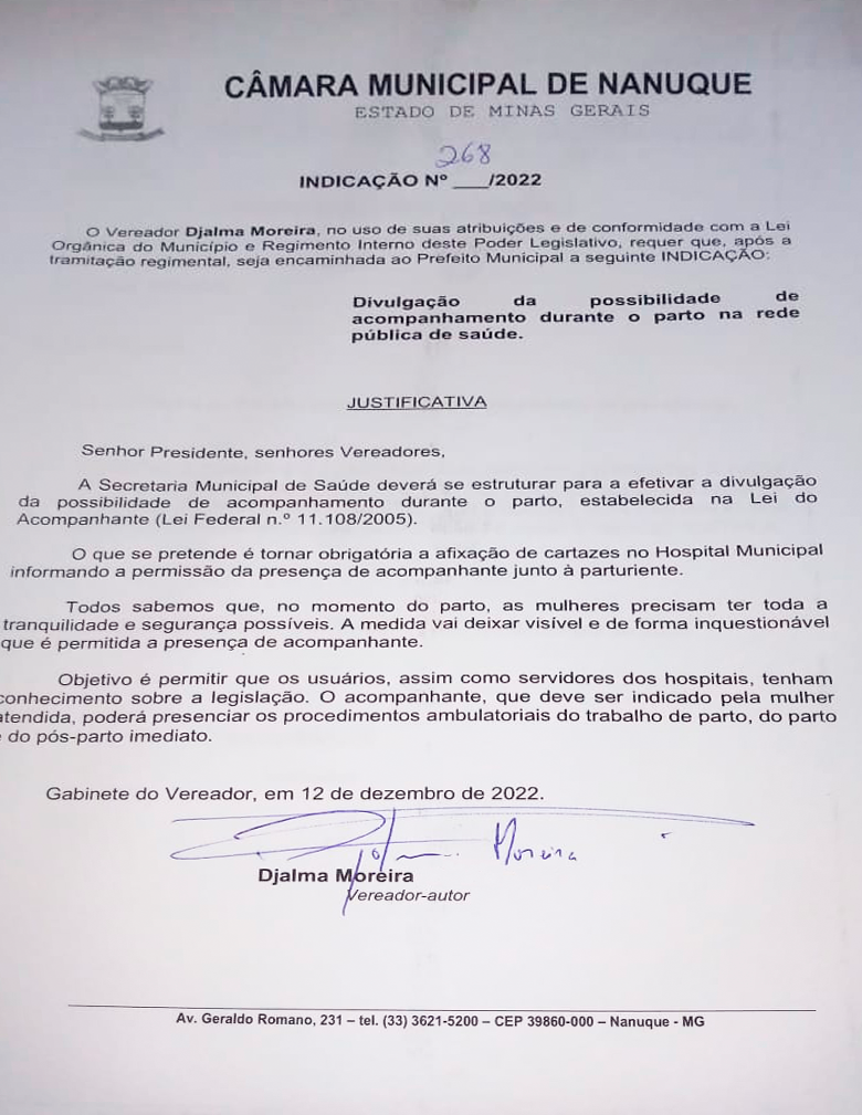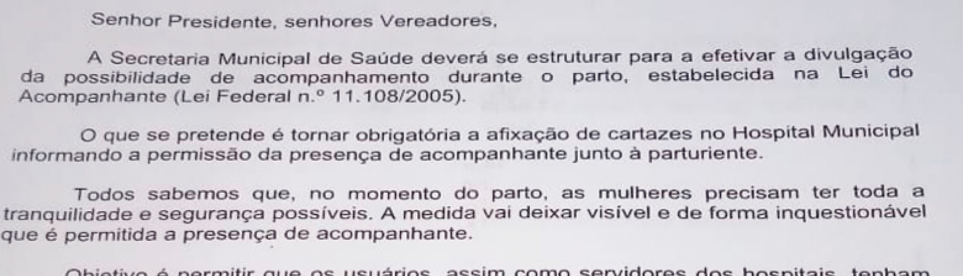 Visando a àrea da saúde pública o vereador propõe que a Secretaria Municipal de Saúde deverá se estruturar para efetivar a divulgação da possibilidade de acompanhamento durante parto, o que se pretende é tornar obrigatória a afixação de cartazes no Hospital Municipal informando a permissão da presença de acompanhante junto à parturiente.: A presença do acompanhante promove confiança e segurança no momento do parto, além de ser uma fonte de apoio e força, capaz de amenizar a dor e a sensação de solidão e gerar bem-estar emocional e físico.