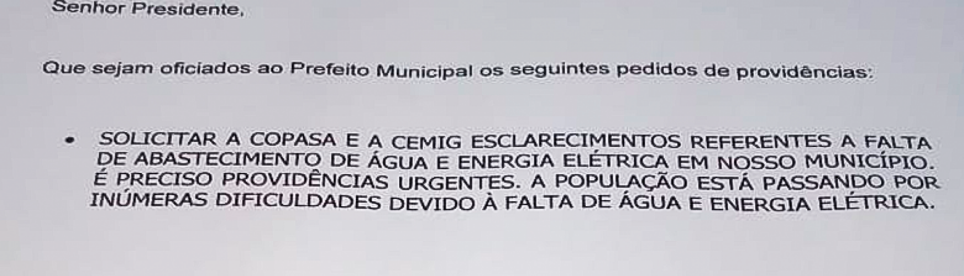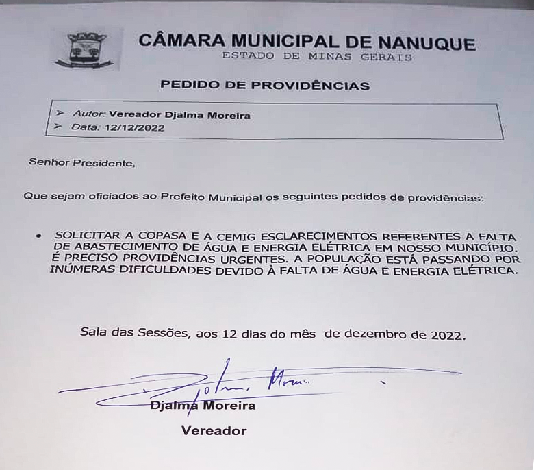 Devido à falta de água iminente em vários pontos da cidade de Nanuque, a população tem passado por dificuldades em suas residências. Em nome dos populares o vereador Djalma solicita que seja solicitada à COPASA (Companhia de Saneamento de Minas Gerais) e a CEMIG (Companhia Energética de Minas Gerais) esclarecimentos referentes a falta de abastecimento de água e energia elétrica no município.