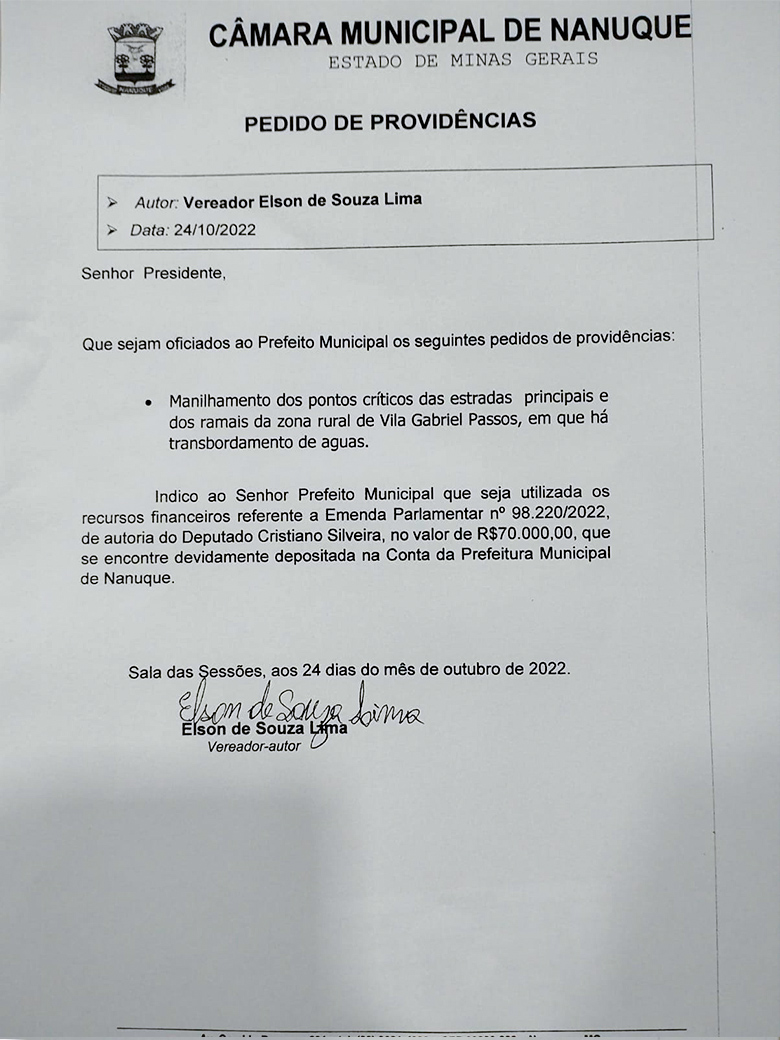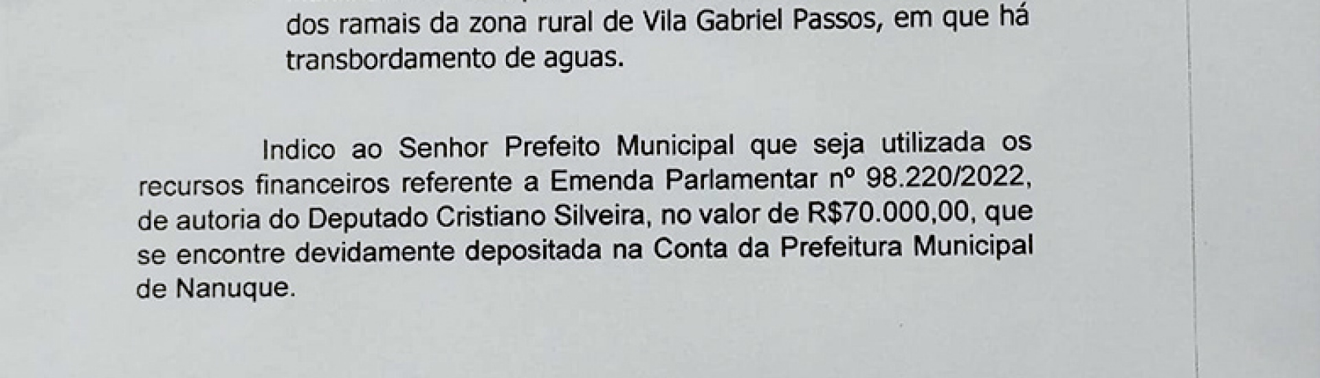 • Manilhamento dos pontos críticos das estradas principais e das ramais da zona rural de Vila Gabriel Passos, em que há transbordamento de águas. Solicitando ao Prefeito Municipal que seja utilizada os recursos financeiros referente a emenda parlamentar nº 98.220/2022, de autoria do deputado Cristiano Silveira, no valor de R$70.000,00 que se encontre devidamente depositada na Conta da Prefeitura Municiapl de Nanuque.