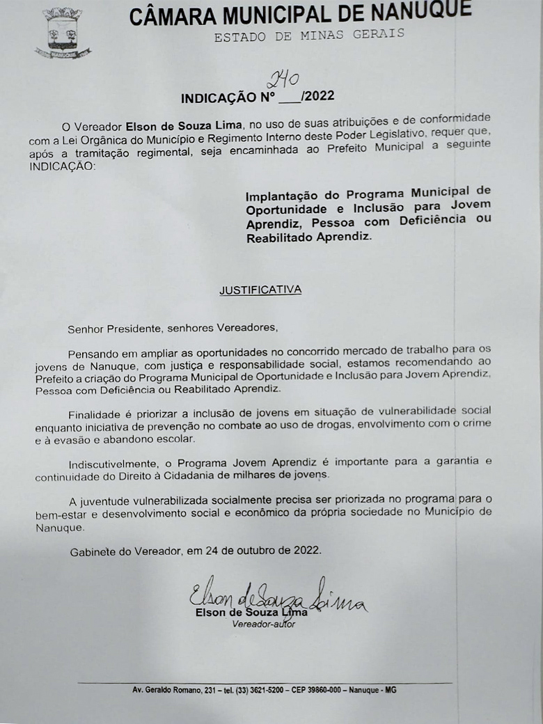 Com o objetivo de sugerir à Administração Municipal, a adoção de medida político administrativa de interesse da comunidade, o vereador de Nanuque Elson de Souza Lima, apresenta as seguintes indicações na Câmara Municipal: