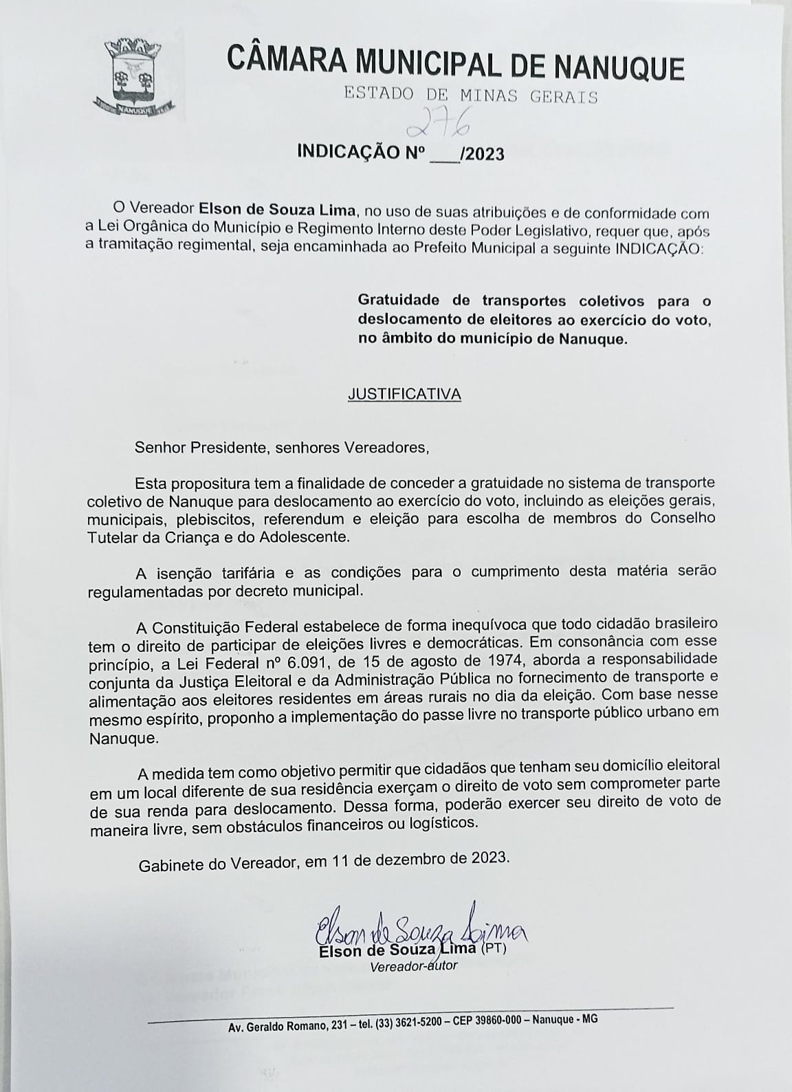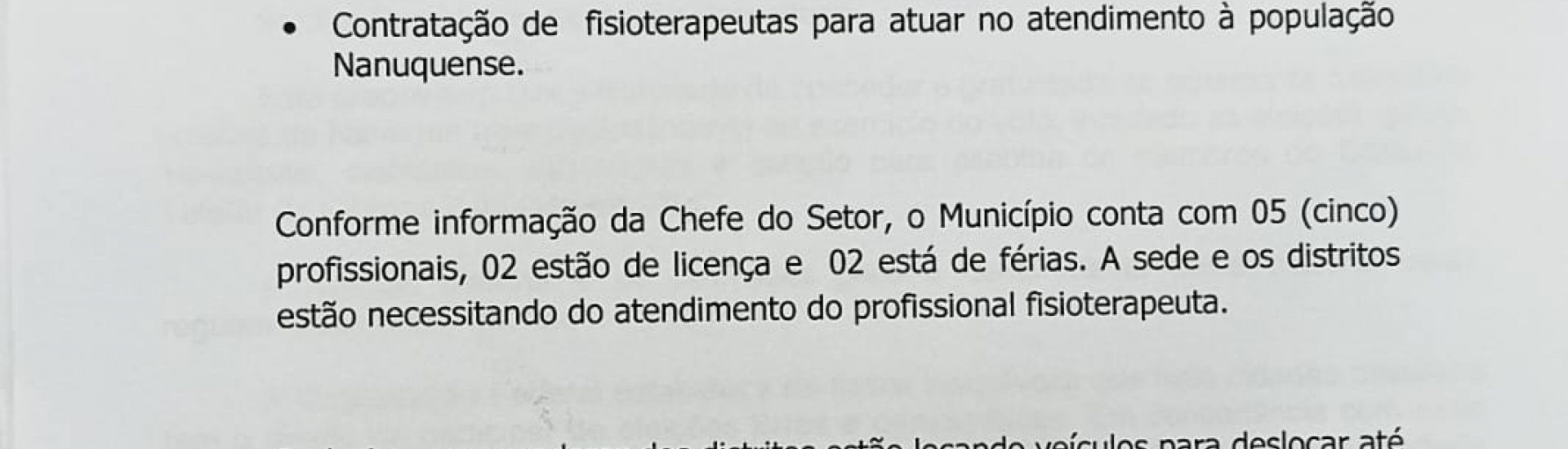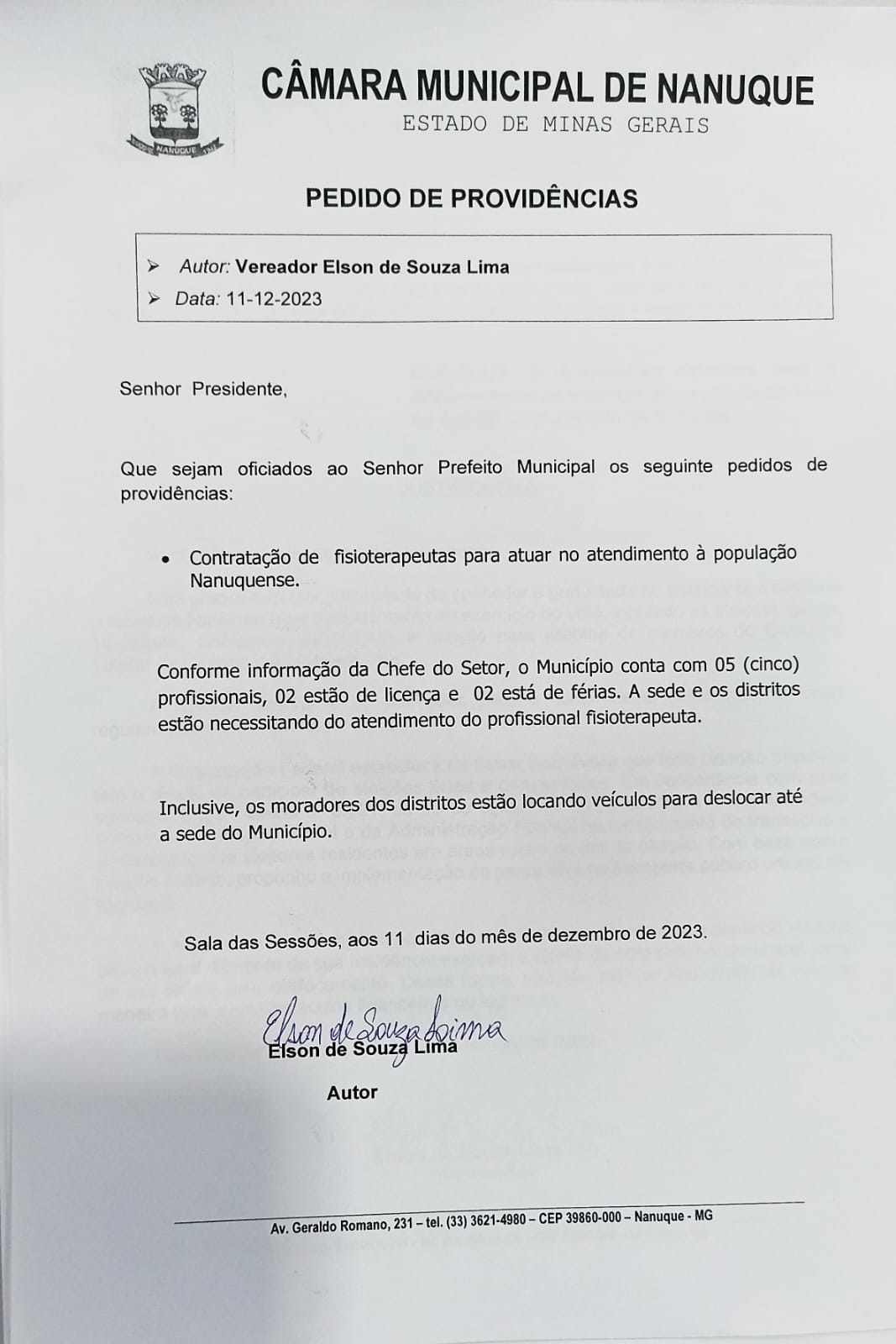 O vereador Elson Lima faz a seguinte pedido a Gestão Municipal, a contração de fisioterapeutas para atuar no atendimento da população.