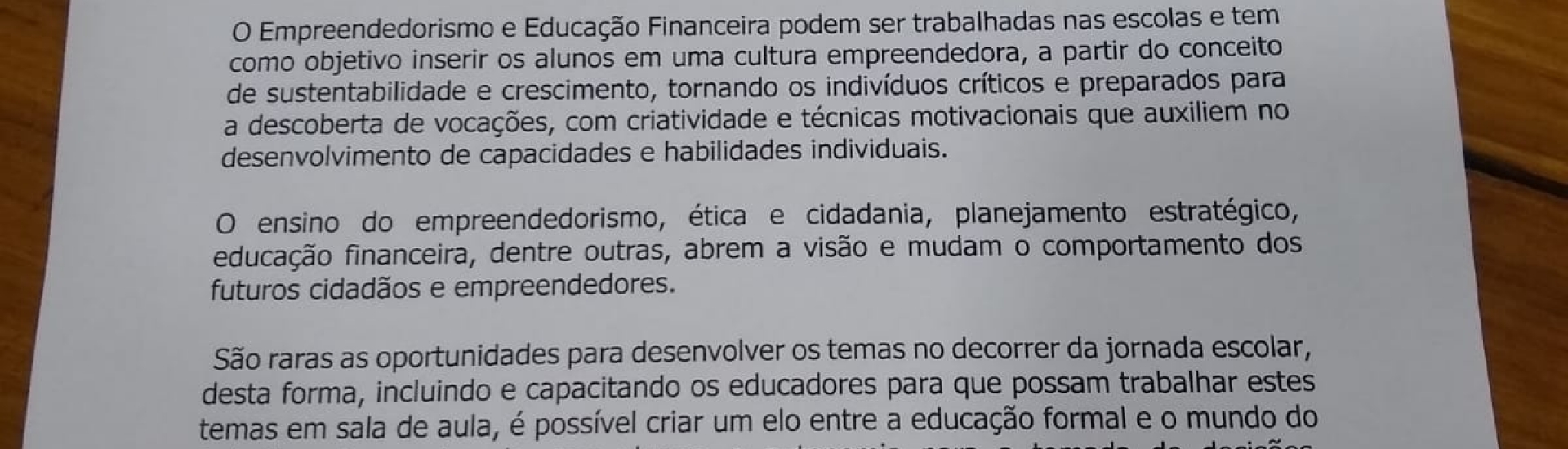 O Ensino do empreendedorismo, ética e cidadania, planejamento estratégico, educação financeira, dentre outras, abrem a visão e mudam o comportamento dos futuros cidadãos e empreendedores.