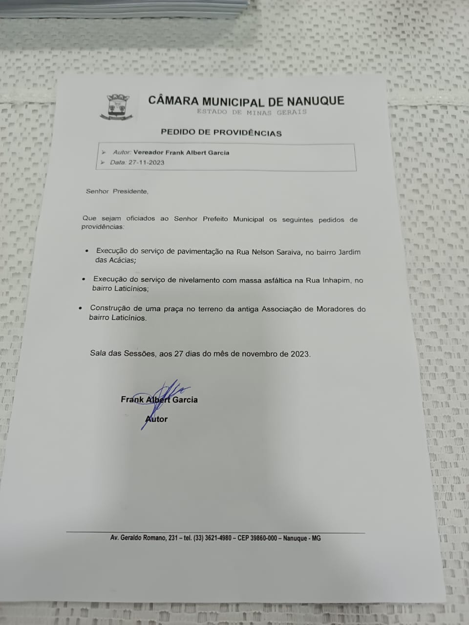 Com o objetivo de sugerir à Administração Municipal, a adoção de medida político administrativa de interesse da comunidade, o vereador de Nanuque Frank Albert Garcia fez diversas indicações para Nanuque.
